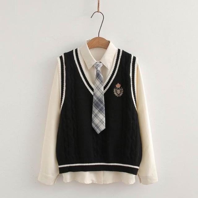 ibella 艾貝拉學院風徽章針織背心+襯衫+領帶三件套裝【55-24-858158-25】F 尺寸