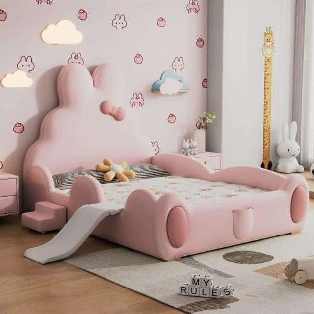 免運費/免關稅 兔子少女心床 生態皮兒童床 女孩公主床 女生粉色臥室床 滑梯床 護欄床 床組床架 掀床 儲物床 皮藝床