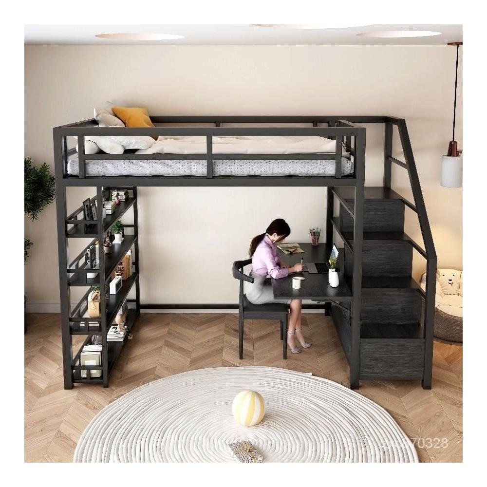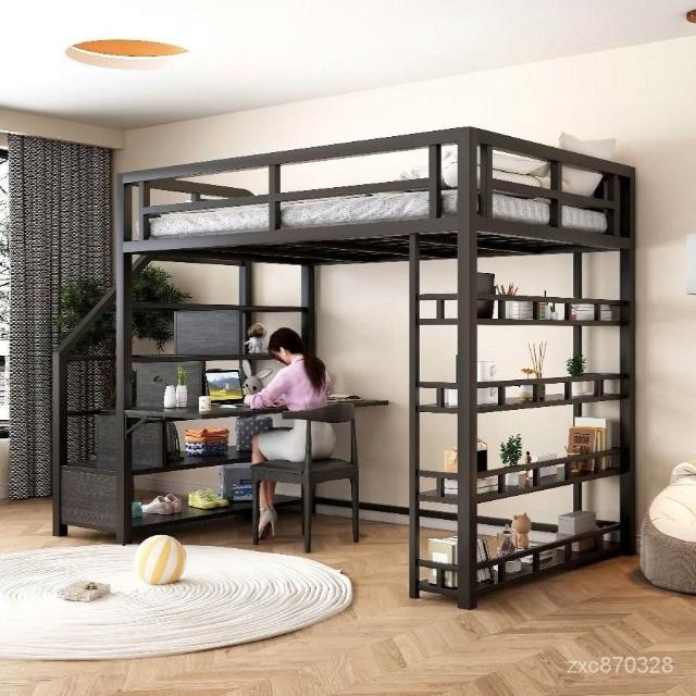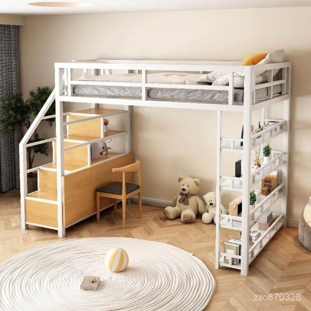 嚴選精品 鐵藝高架床小戶型上床下桌帶書架多功能省空間閣樓式單上層樓閣床宿捨高架床 上下床 單人床 學生高架床 正麵梯款