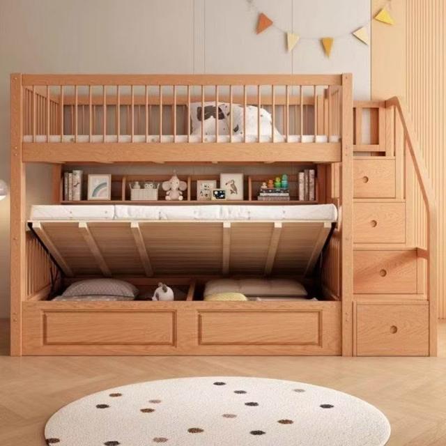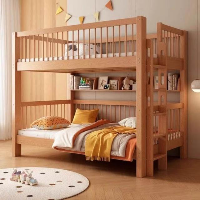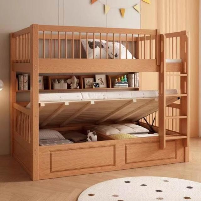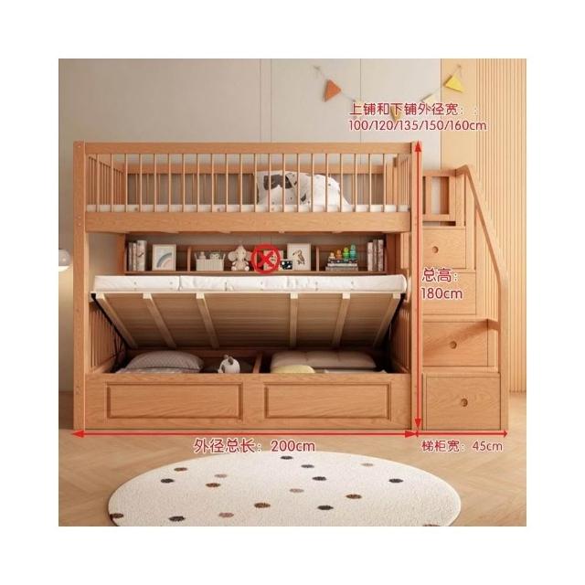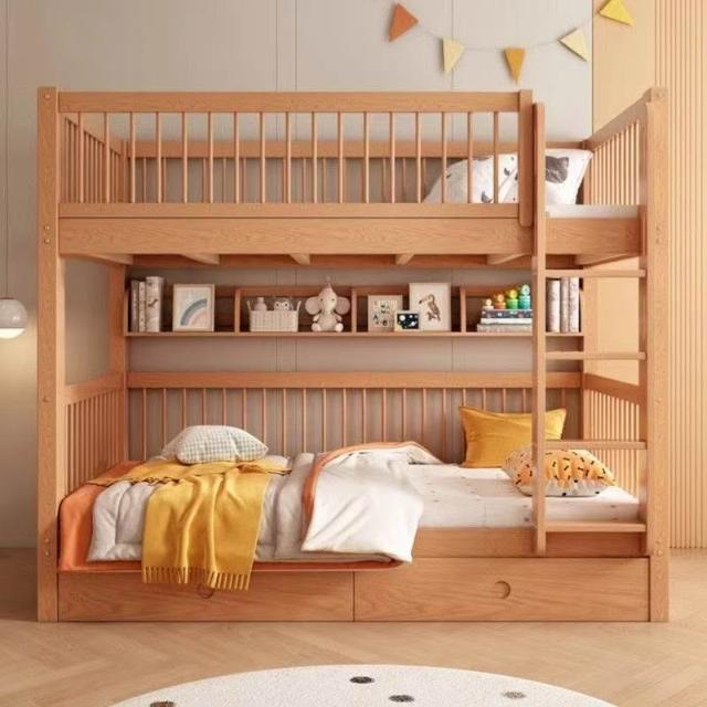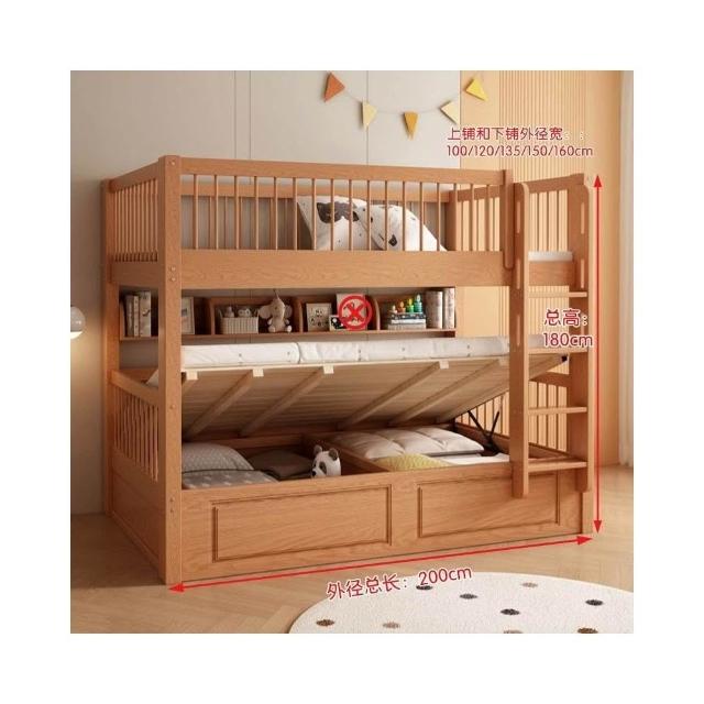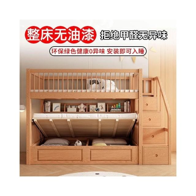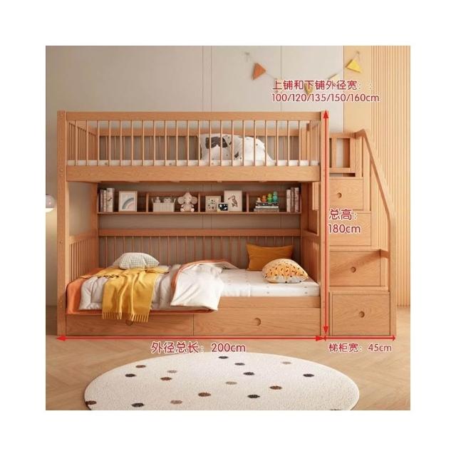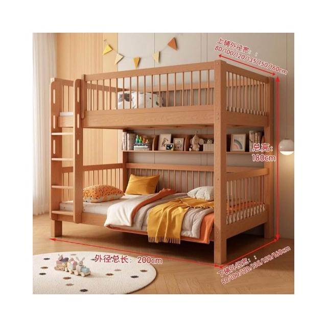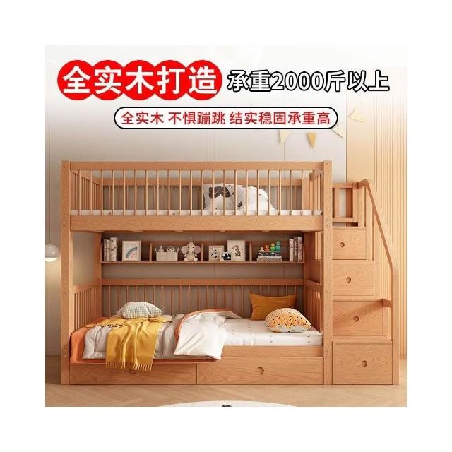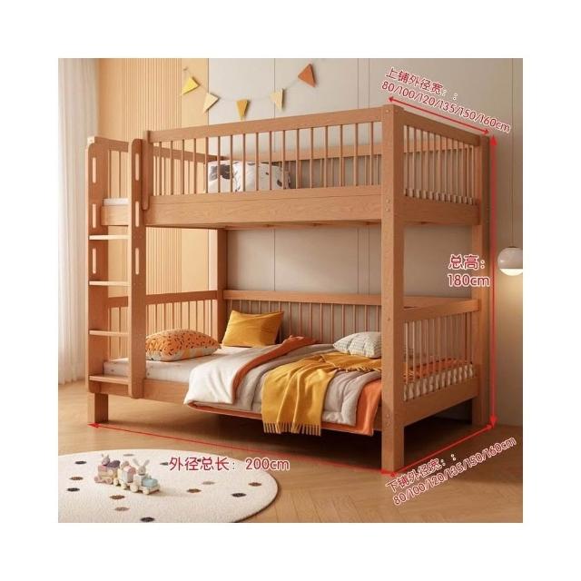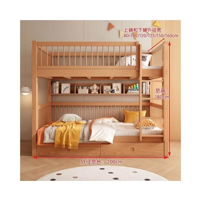 櫸木上下床雙層兒童實木加高圍欄上下鋪木床子母床上下同寬書架床