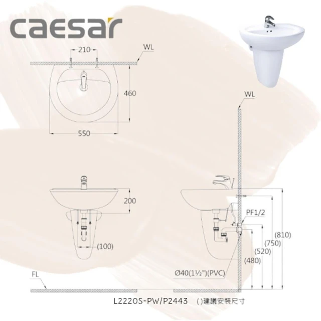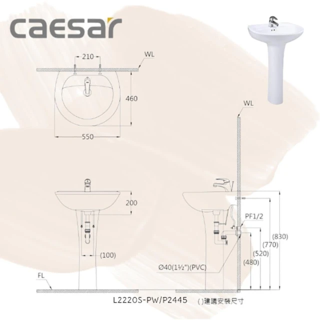 CAESAR 凱撒衛浴單孔面盆 壁掛面盆 洗手台 L2220S-PW 搭配長/短瓷腳(面盆)