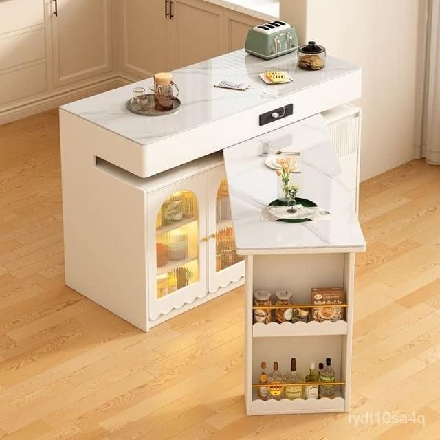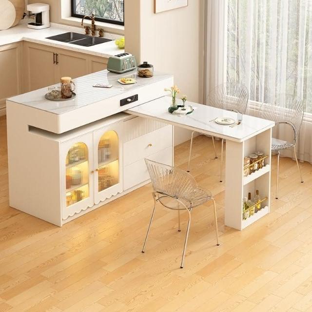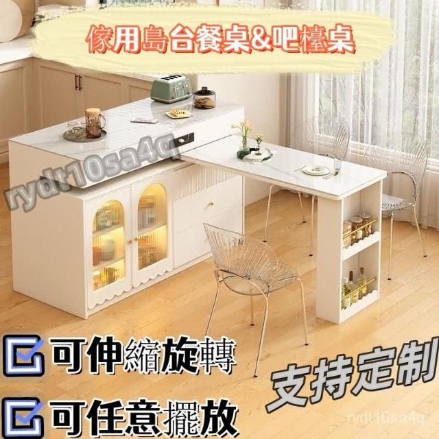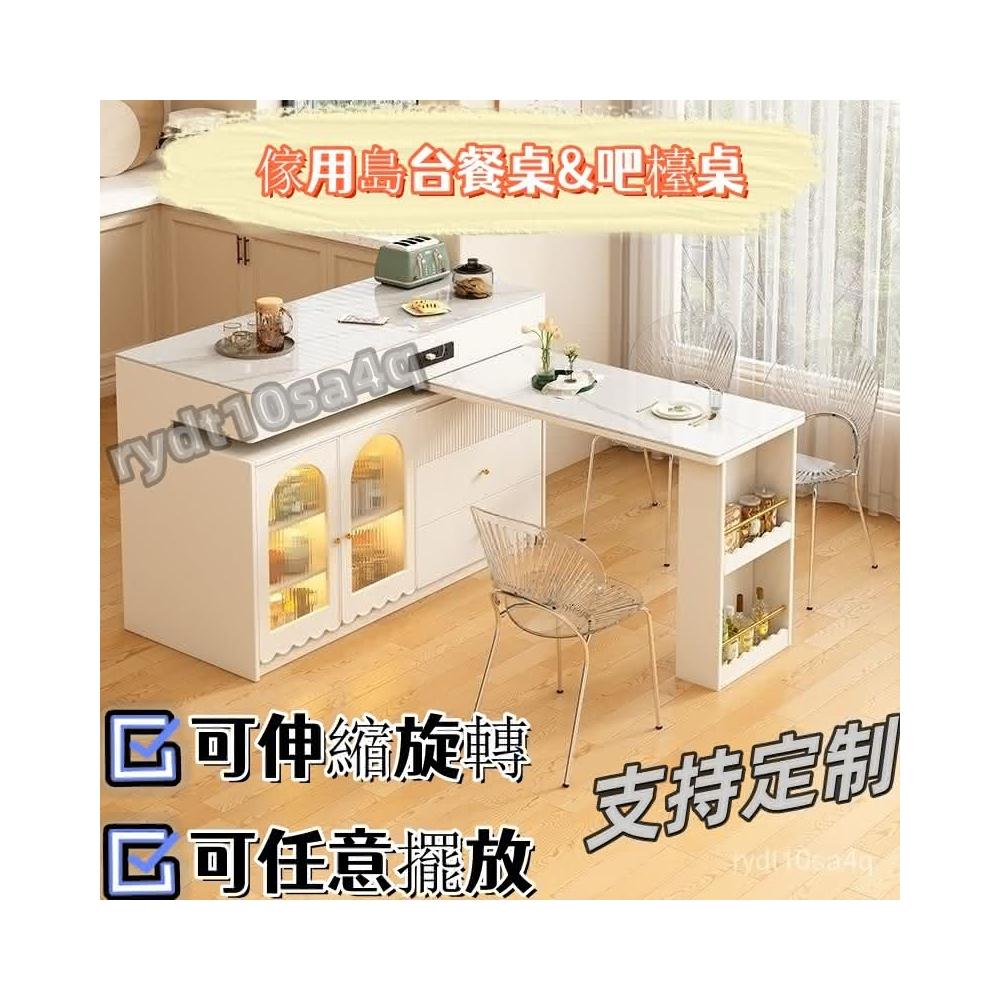 北歐免稅 工廠直銷 小戶型首選奶油風巖闆島臺餐桌一體可旋轉伸縮儲物小戶型傢用實木廚房吧臺桌桌子 餐桌