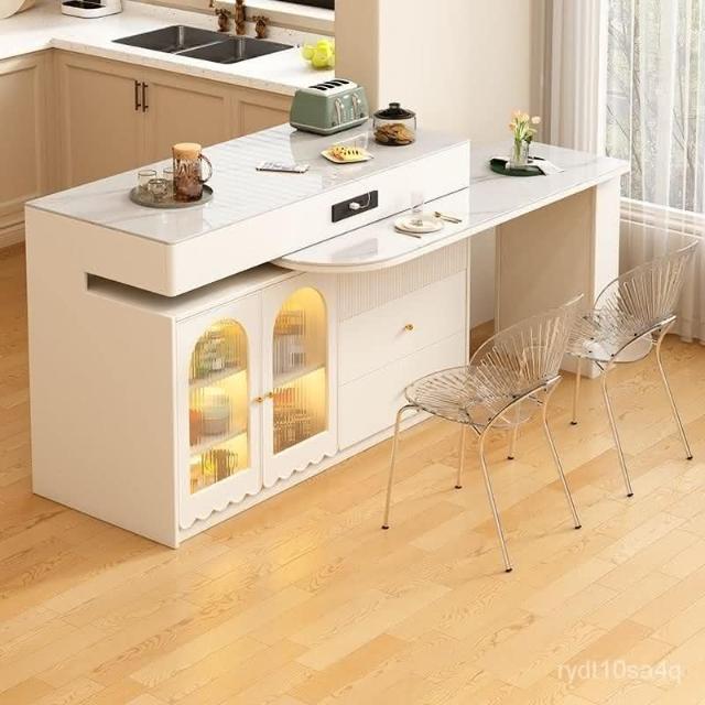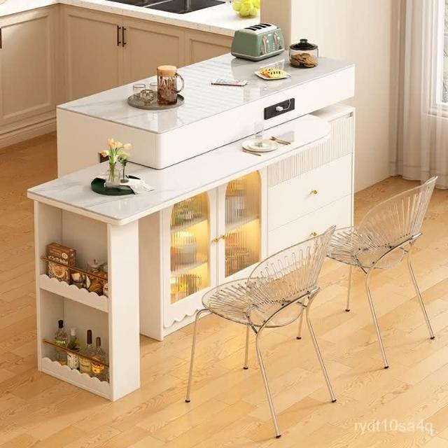 北歐免稅 工廠直銷 小戶型首選奶油風巖闆島臺餐桌一體可旋轉伸縮儲物小戶型傢用實木廚房吧臺桌桌子 餐桌