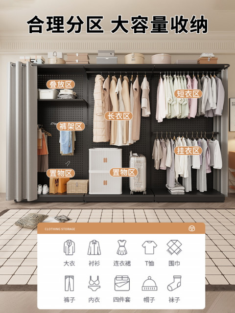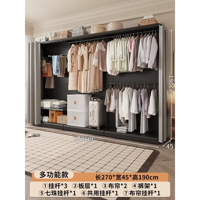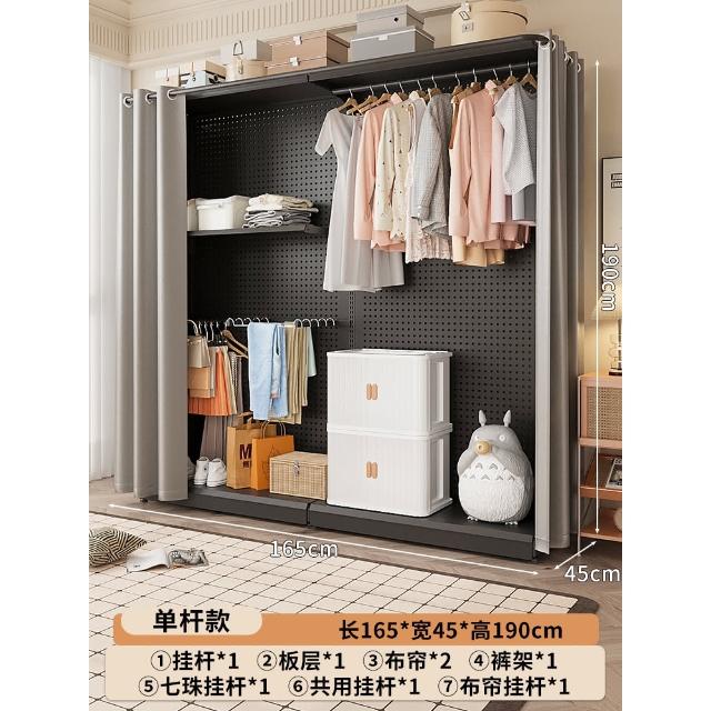 洞洞板簡易衣櫃臥室家用組裝金屬衣櫥出租房用開放式防塵簾掛衣架