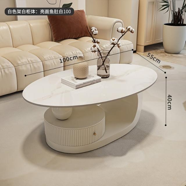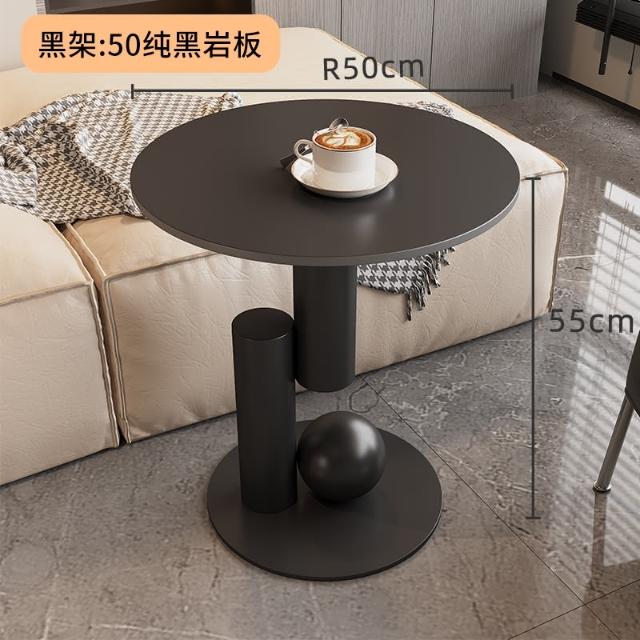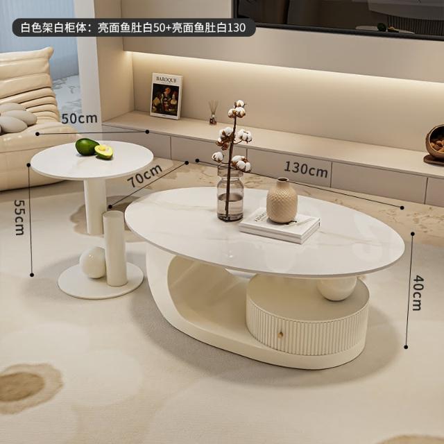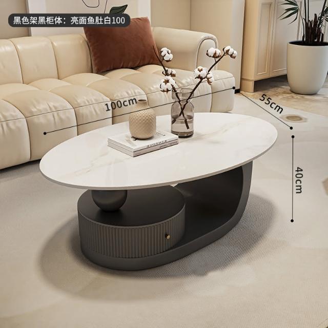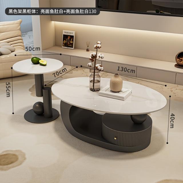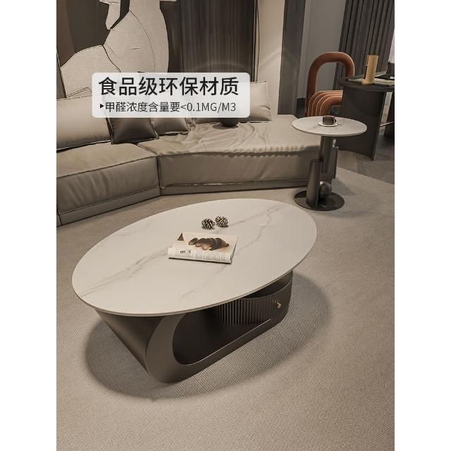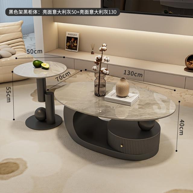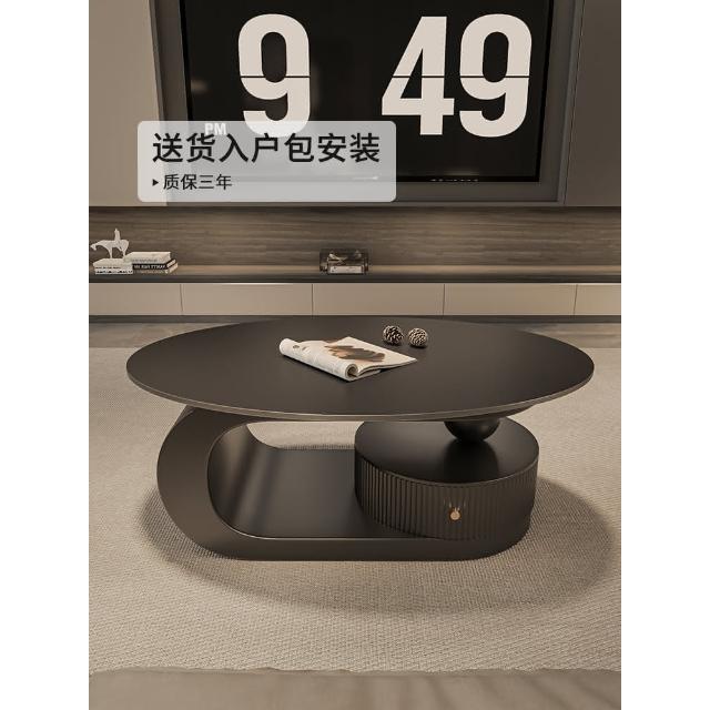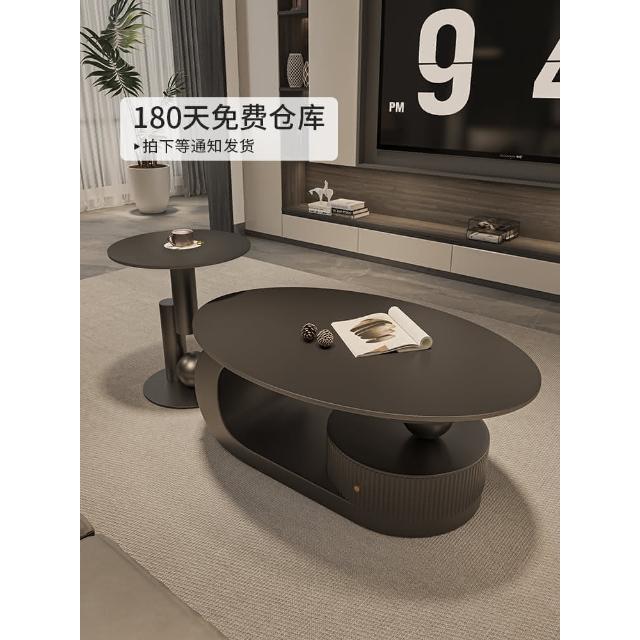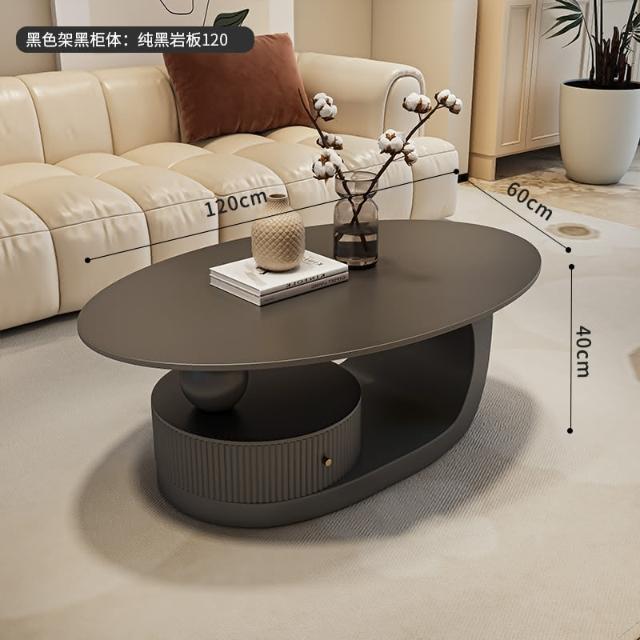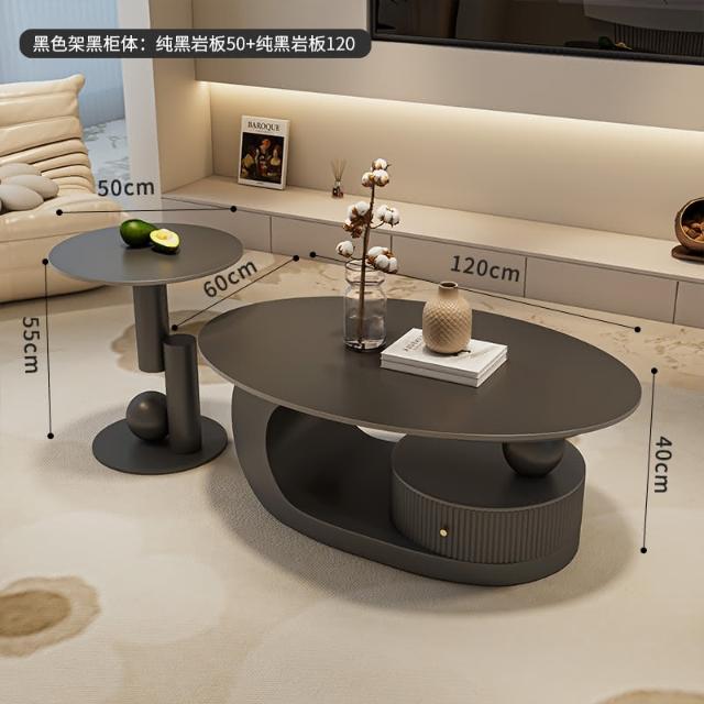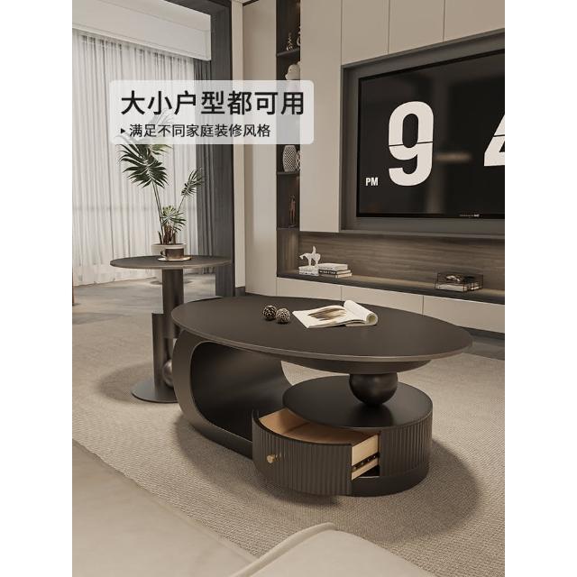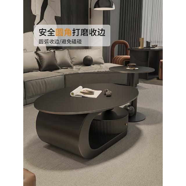意式岩板橢圓形黑色茶几客廳家用輕奢高級感現代小戶型茶邊幾組合
