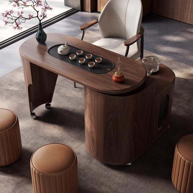 意式輕奢陽臺家用泡茶桌實木移動茶臺簡約小戶型可旋轉胡桃色茶車