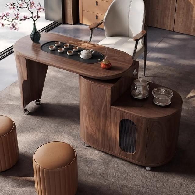 意式輕奢陽臺家用泡茶桌實木移動茶臺簡約小戶型可旋轉胡桃色茶車