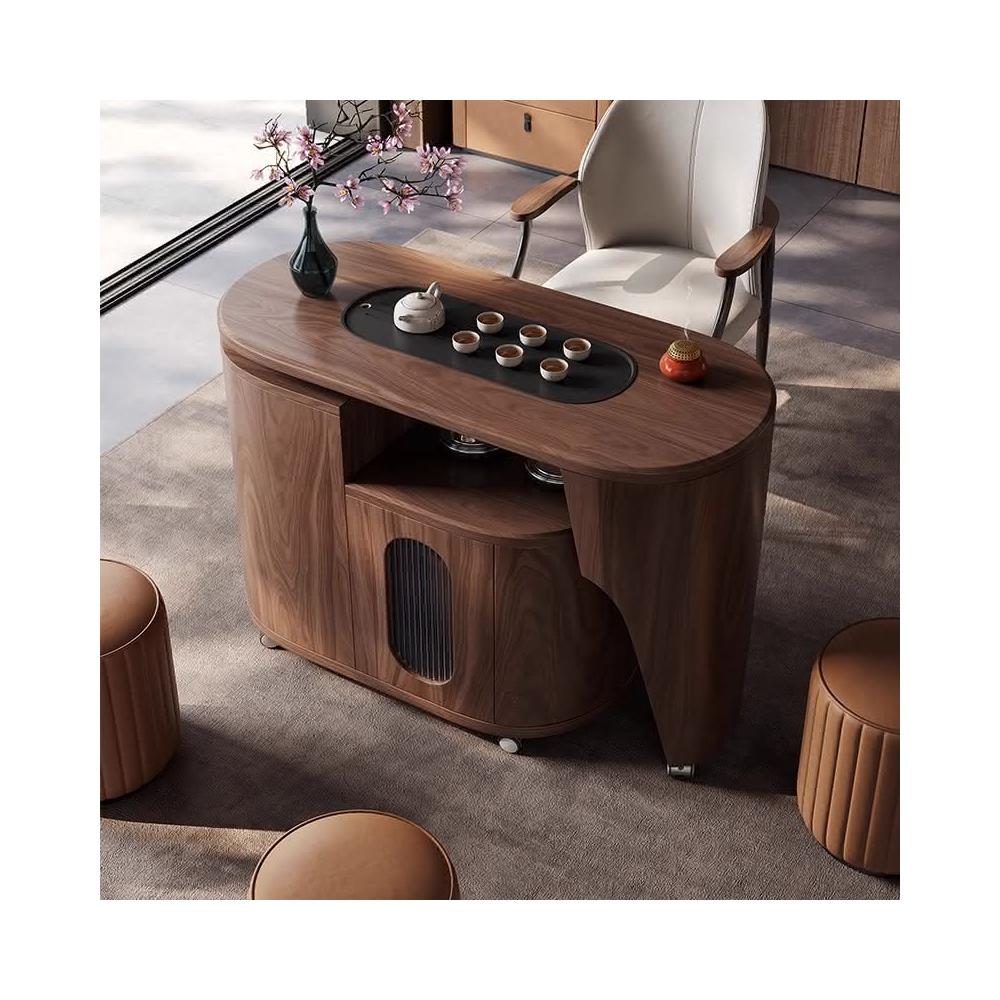 意式輕奢陽臺家用泡茶桌實木移動茶臺簡約小戶型可旋轉胡桃色茶車