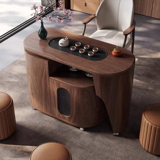 意式輕奢陽臺家用泡茶桌實木移動茶臺簡約小戶型可旋轉胡桃色茶車