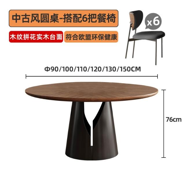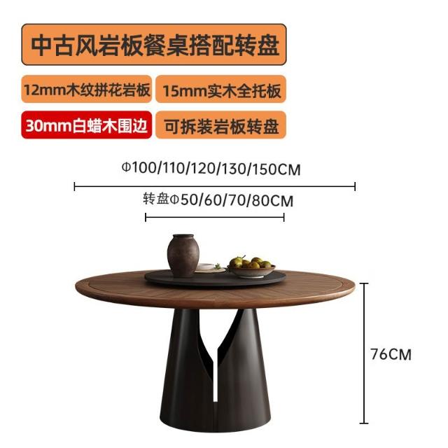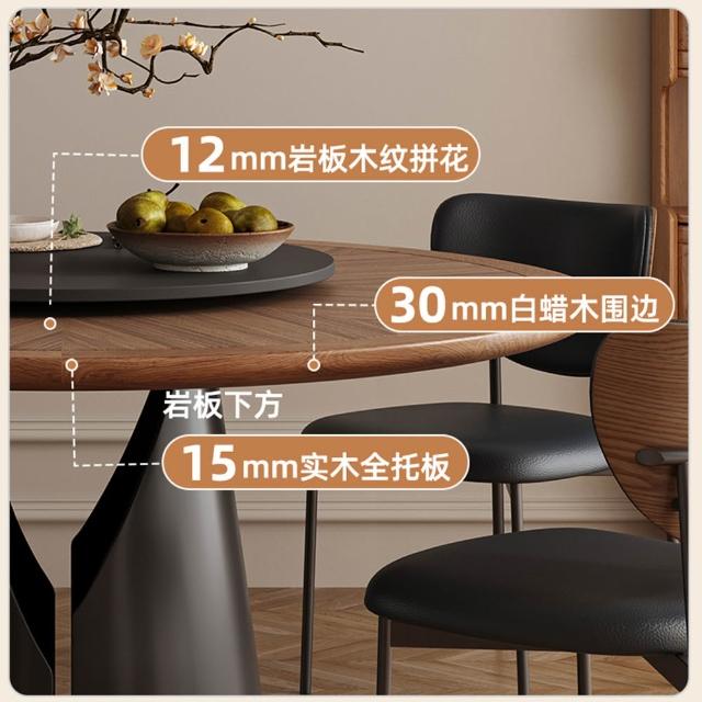 中古風實木餐桌紋理圓形岩板餐桌法式復古奶油家用高端帶轉盤飯桌