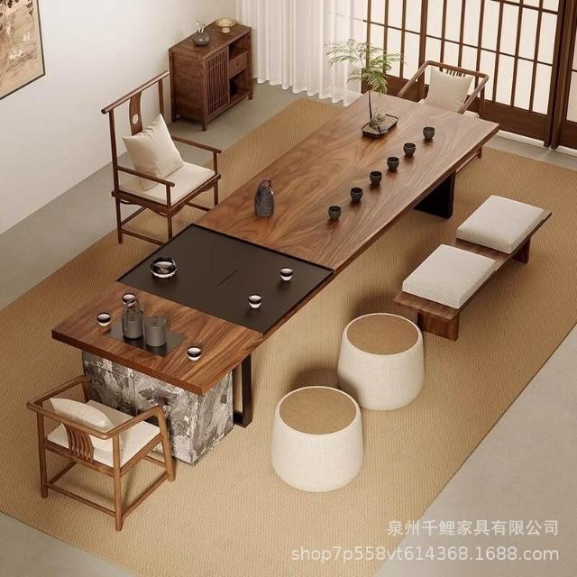 新中式茶桌宋代美學黑胡桃木喝茶桌椅組合客廳辦公室大板茶臺一體