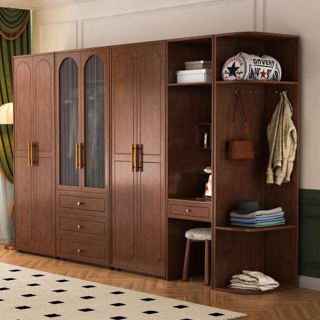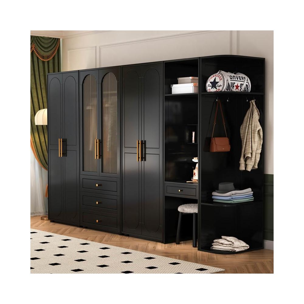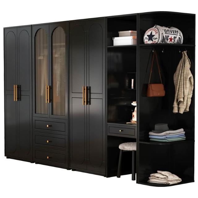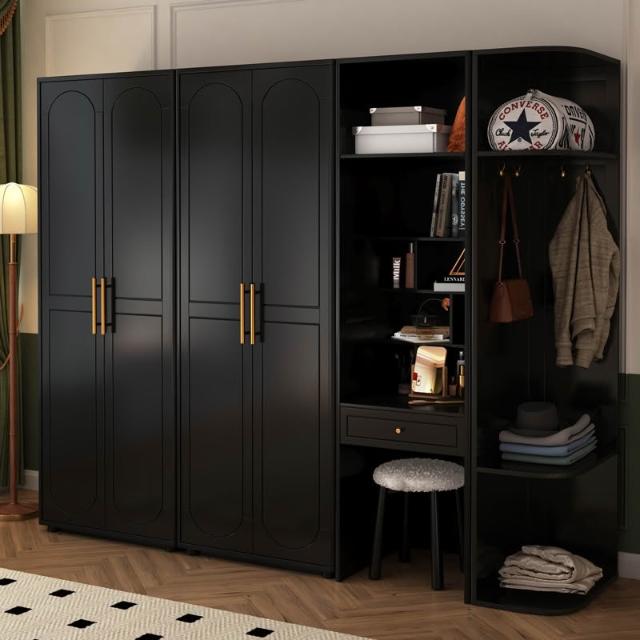 美式實木衣櫃黑色現代簡約復古法式四門衣櫃收納儲物櫃臥室大衣櫥
