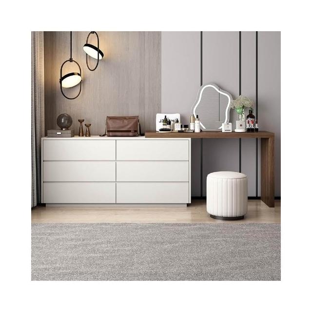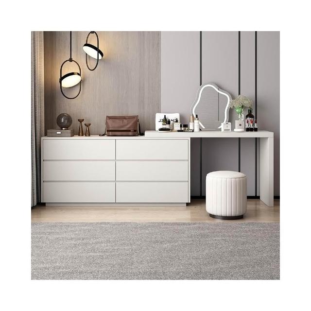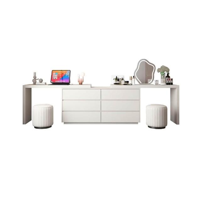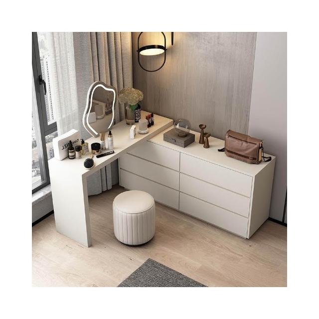 現代簡約奶油色梳粧檯收納櫃書桌一體瓢窗化妝桌轉角梳妝桌妝鏡凳