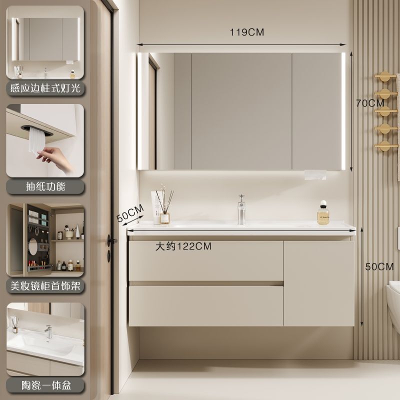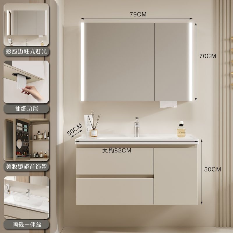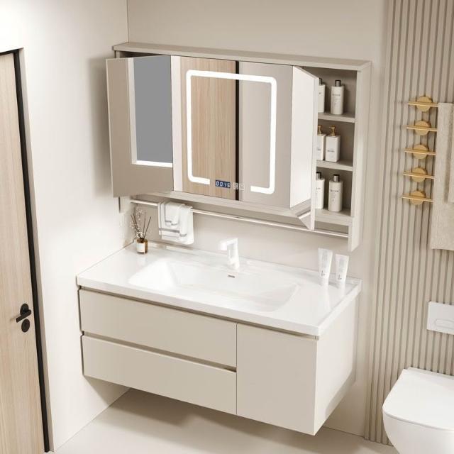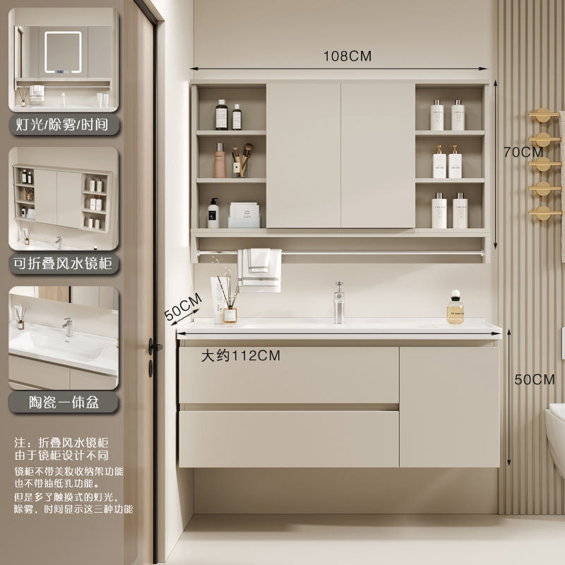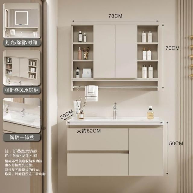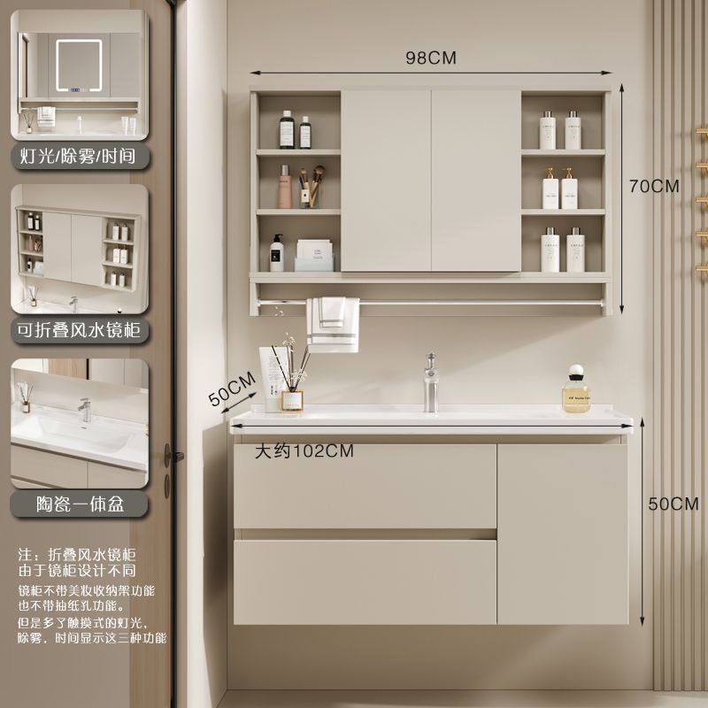 折疊風水鏡洗臉盆櫃組合隱藏鏡櫃浴室櫃奶油風陶瓷一體洗手衛浴櫃