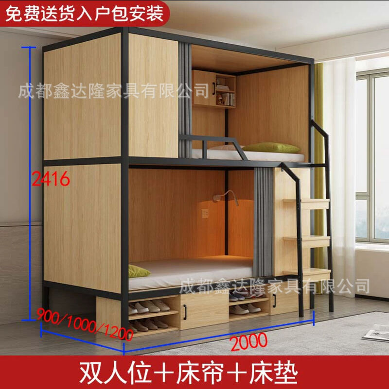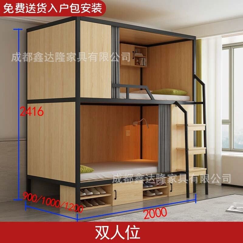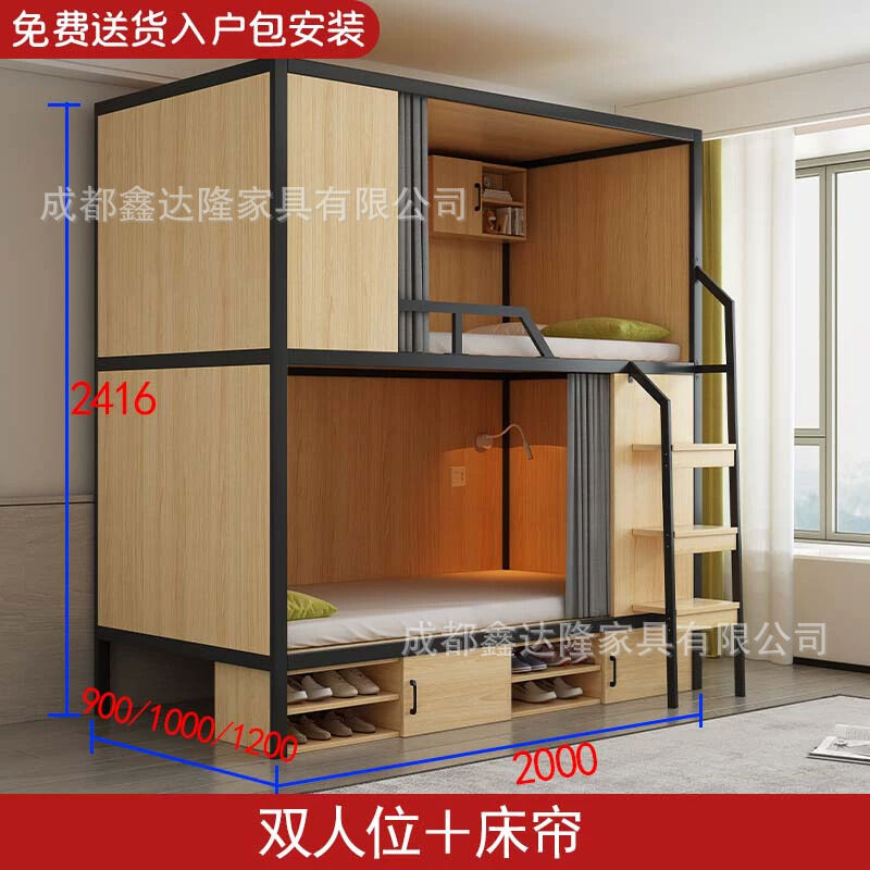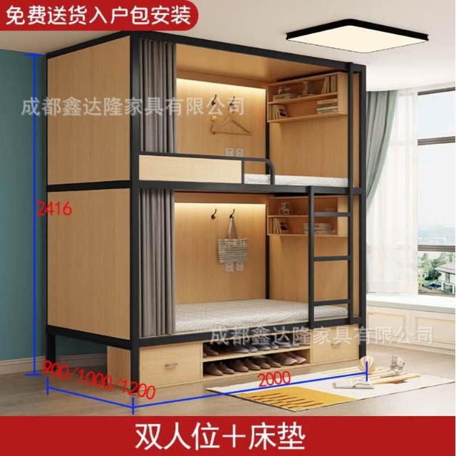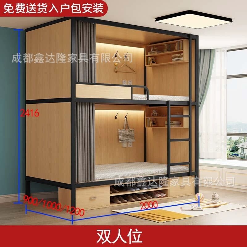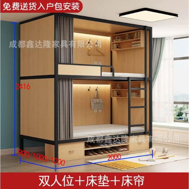 上下鋪雙層床帶窗簾上下床學校雙人太空艙民宿電競酒店鋼木床帶櫃