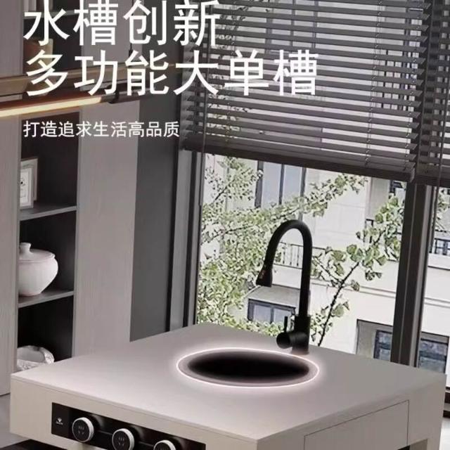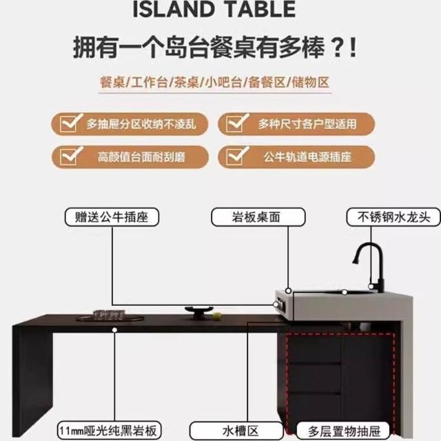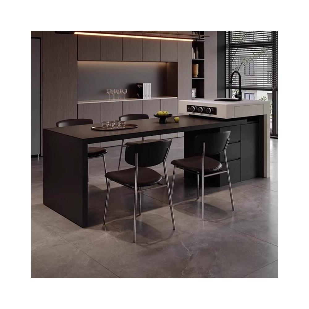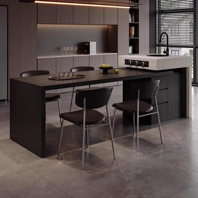 意式極簡純黑巖板帶水槽島臺餐桌一體家用多功能可伸縮廚房中島臺