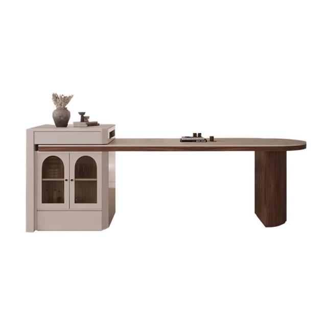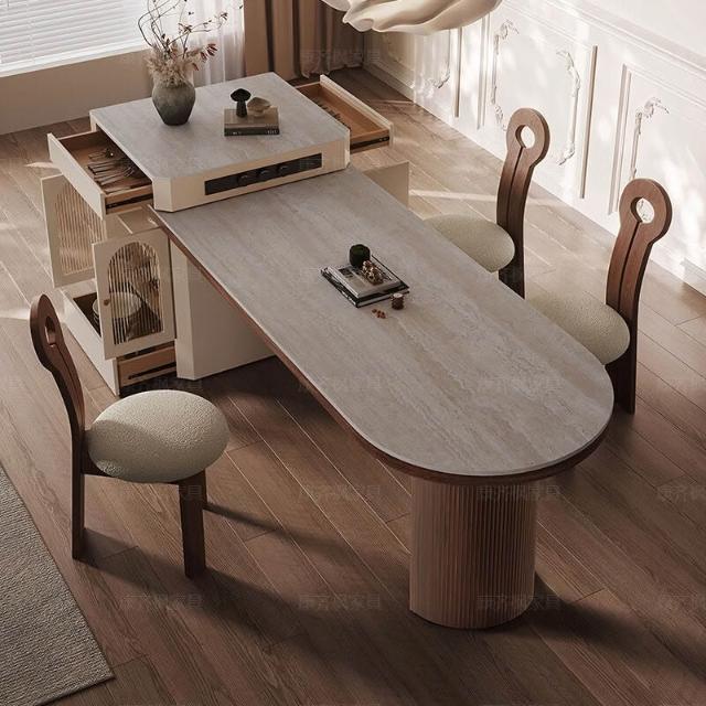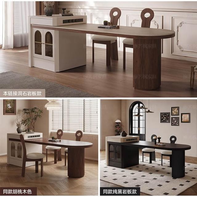 中古風島臺餐桌一體家用胡桃木可伸縮洞石巖板小戶型新款半圓島臺