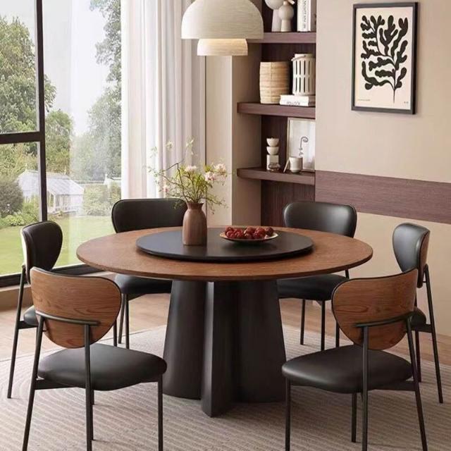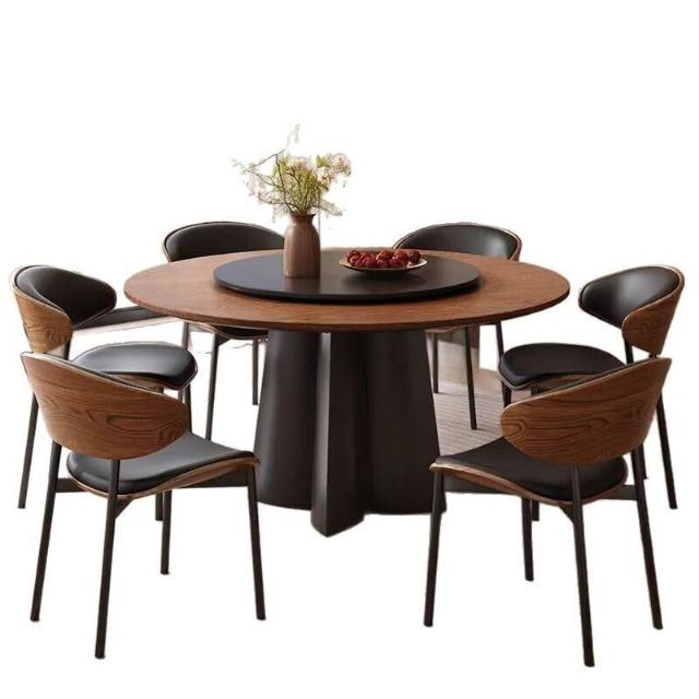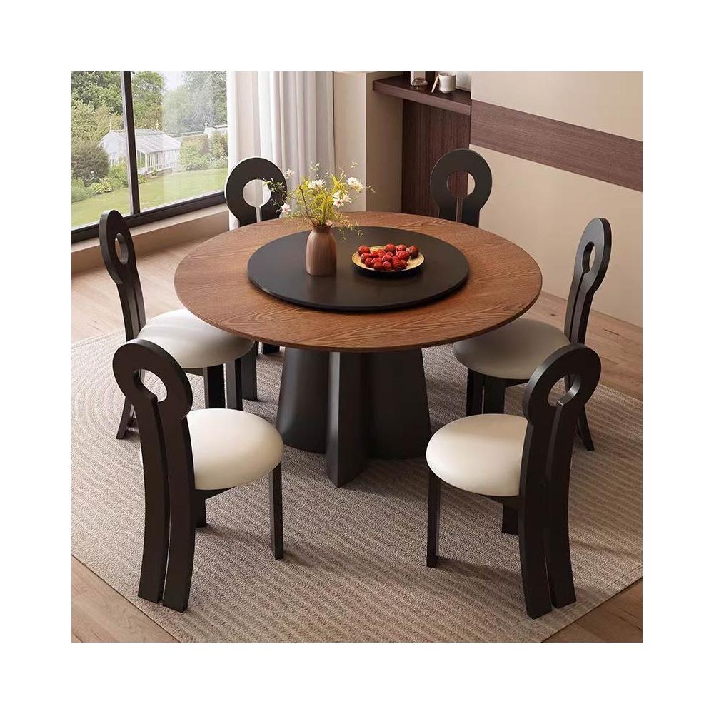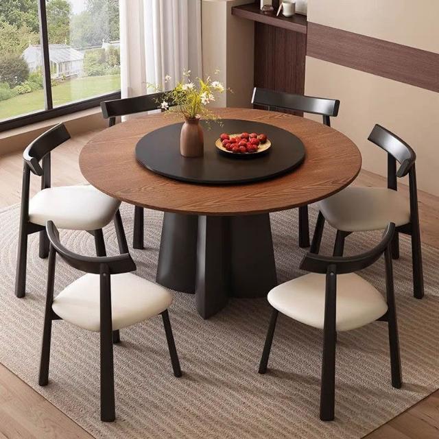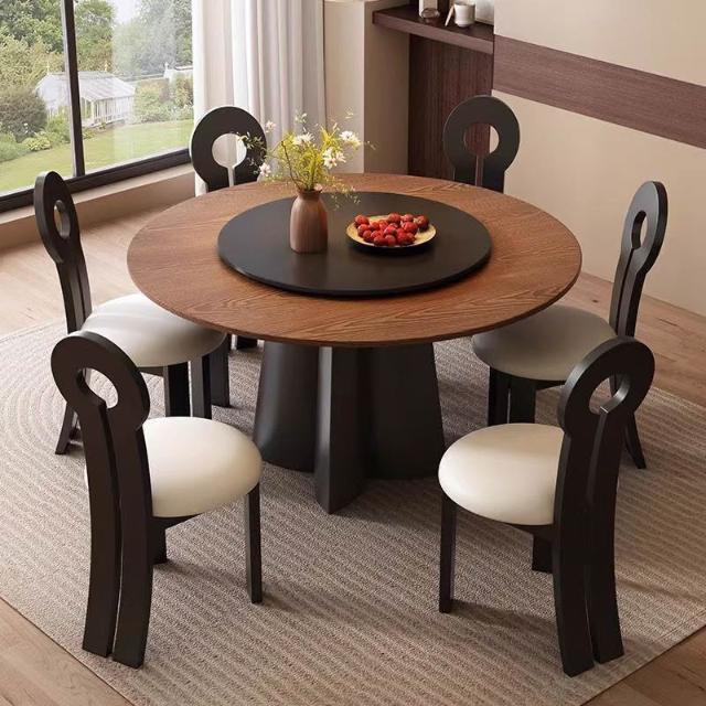 中古風實木餐桌椅圓桌高端家用小戶型法式復古黑胡桃木圓形飯桌子