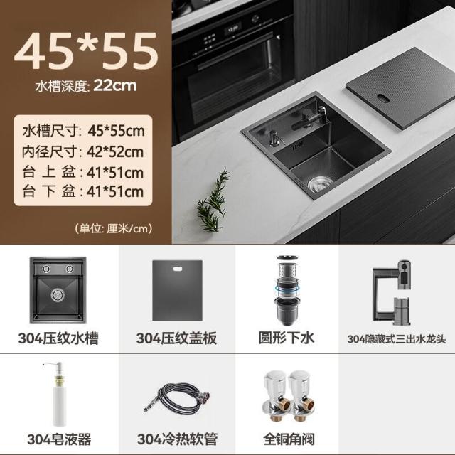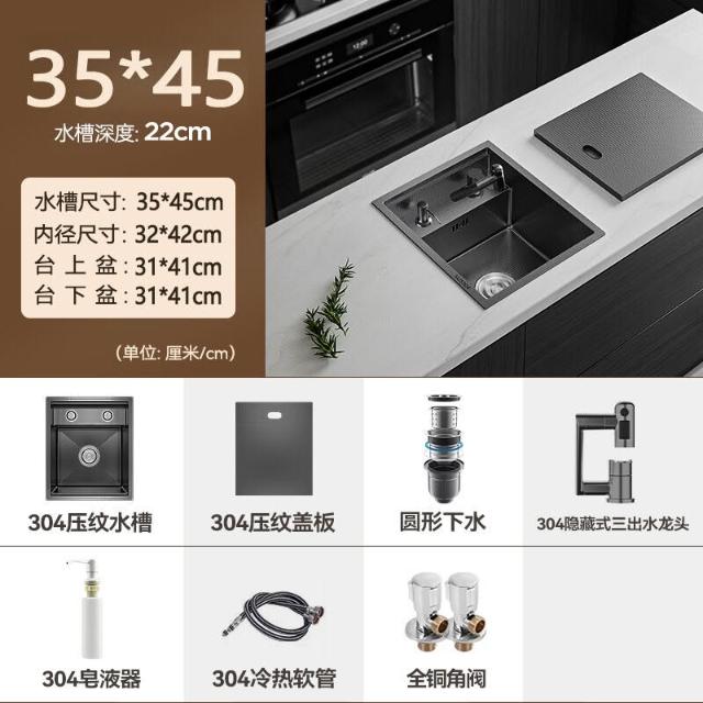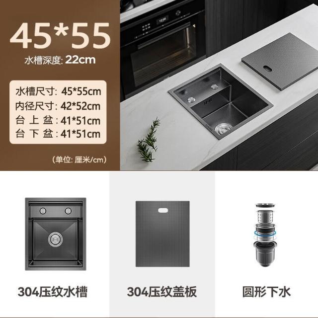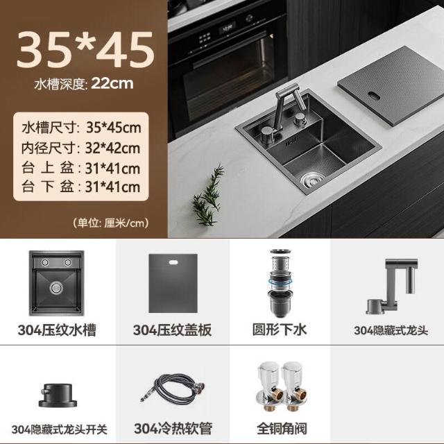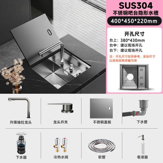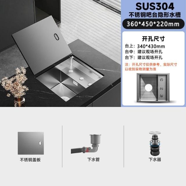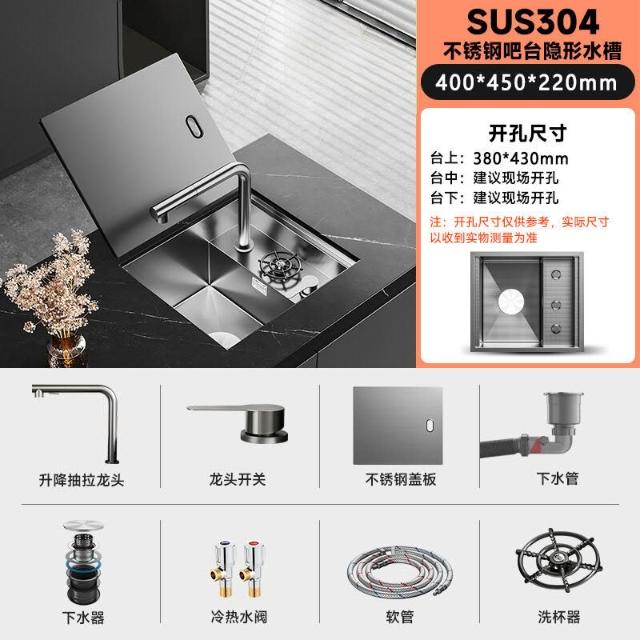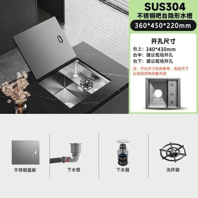 隱藏式黑色304不銹鋼壓紋水槽單槽吧臺隱形帶蓋板中島迷你洗菜盆