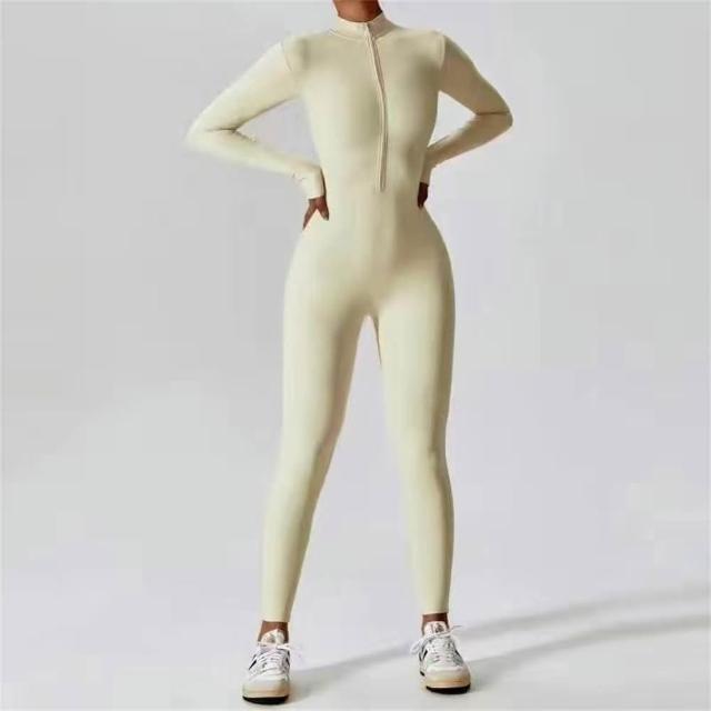(NARMES)歐美拉鏈連體瑜伽服長袖健身運動連體緊身衣女連體褲外穿