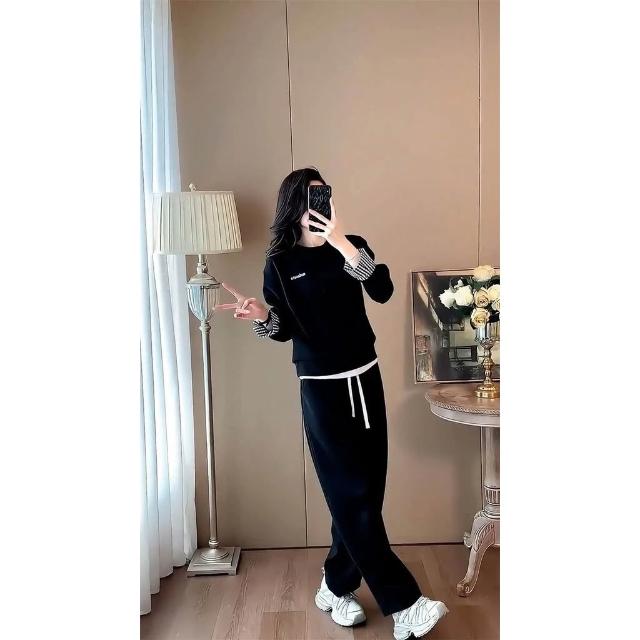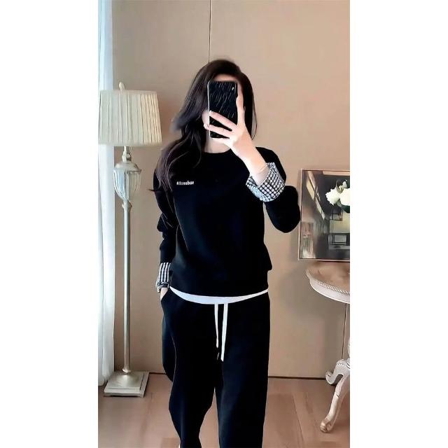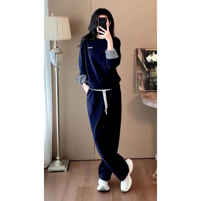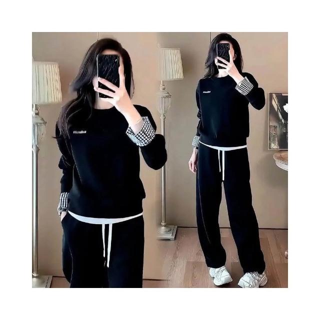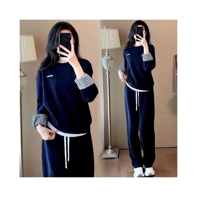 (NARMES)M-4XL 大尺碼 女生套裝 休閒運動服套裝女 大尺碼圓領帽T 假兩件上衣 春秋新款寬鬆衛衣闊腿褲兩件套