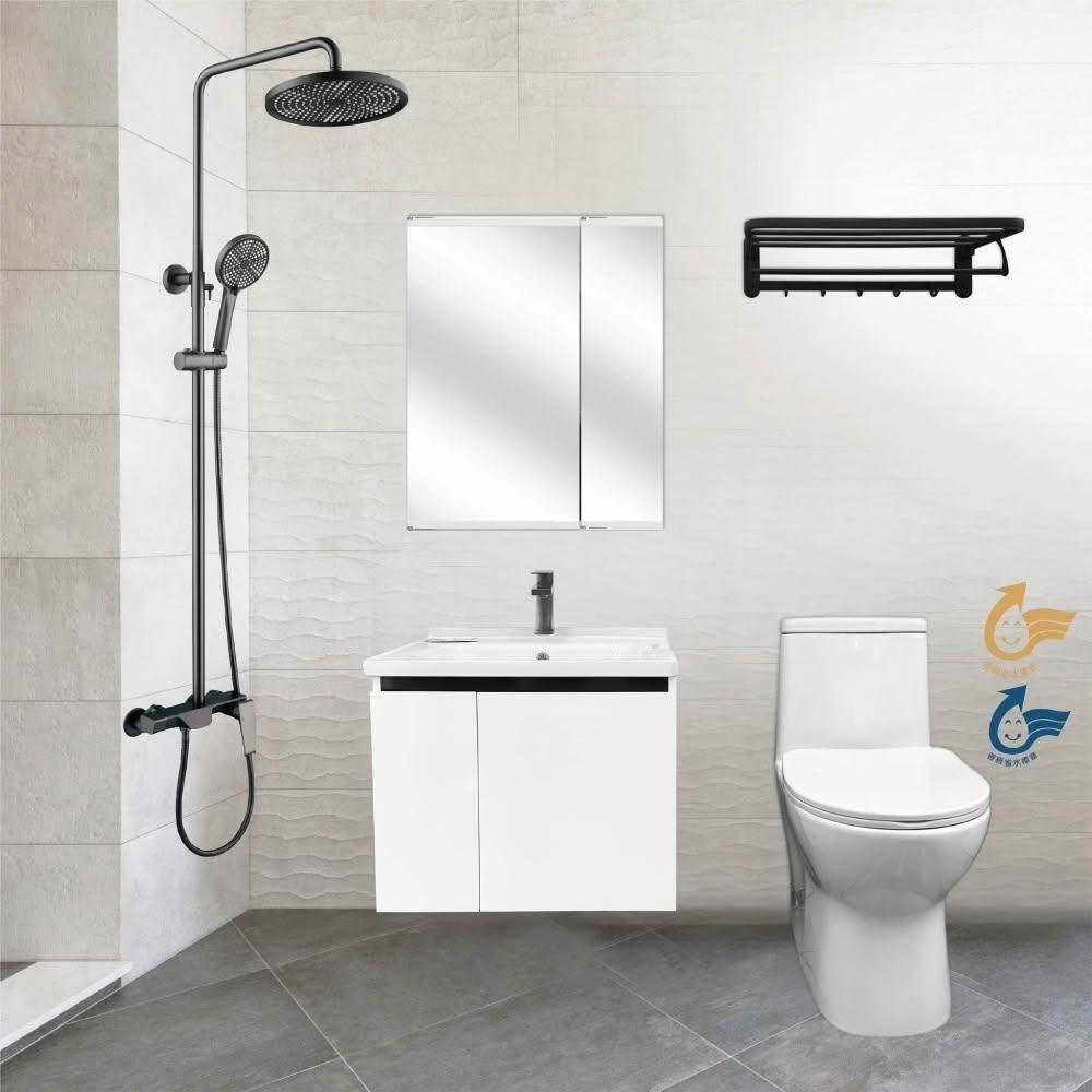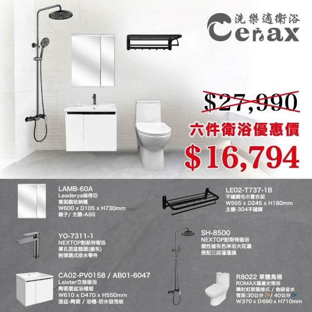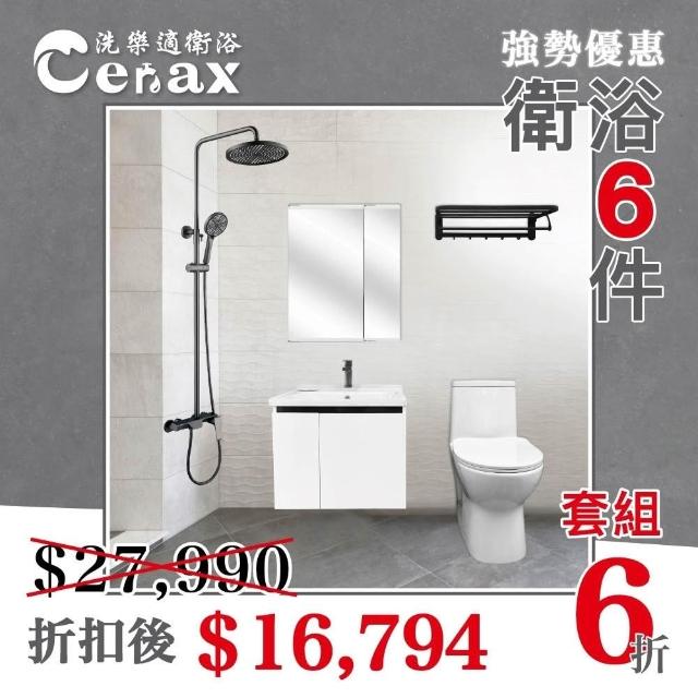 CERAX 洗樂適霧黑系列衛浴六件式套組 投資自用套房推薦 60公分面盆浴櫃+龍捲單體馬桶+日式鏡櫃+烤漆面盆龍頭+烤漆沐浴龍頭+放衣架