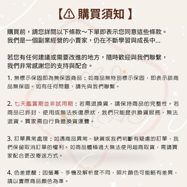 • 購買商品前,請您先閱讀購物須知,下單購買商品即表示同意以下條款,感謝您的配合 1. 商品無保固,小小賣場目前不提供保固喔,有任何問題都可以先跟我們聊聊 2. 七天【鑑賞期非適用期】,如有拆除、使用等,無法恢復原狀等情況,不接受退換貨(食品類的商品拆封後恕不退換) 3. 退貨之商品必須是全新狀態且包裝完整,保持所有商品、附件、包裝、及發票完整性,否則恕不接受退貨 4.訂單如遇到商品異常、缺貨,或者我方判斷有疑慮之訂單,賣場有權取消訂單