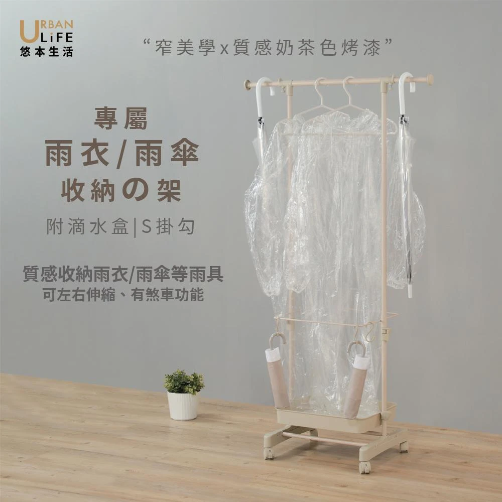 URBAN LiFE 悠本生活雨具の收納置物架附S掛勾滴水盒(雨衣雨傘短傘長摺疊傘收納伸縮衣架/可瀝水移動)