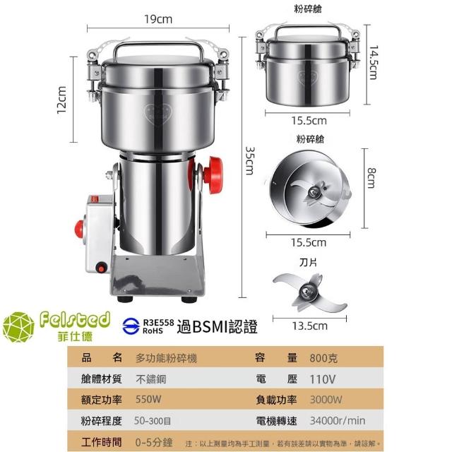 Felsted 菲仕德800克研磨機 2500g精細打粉機 4500g中藥磨粉機 附配件大禮包