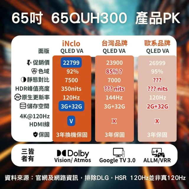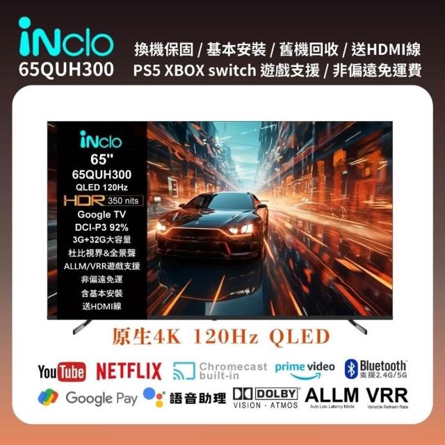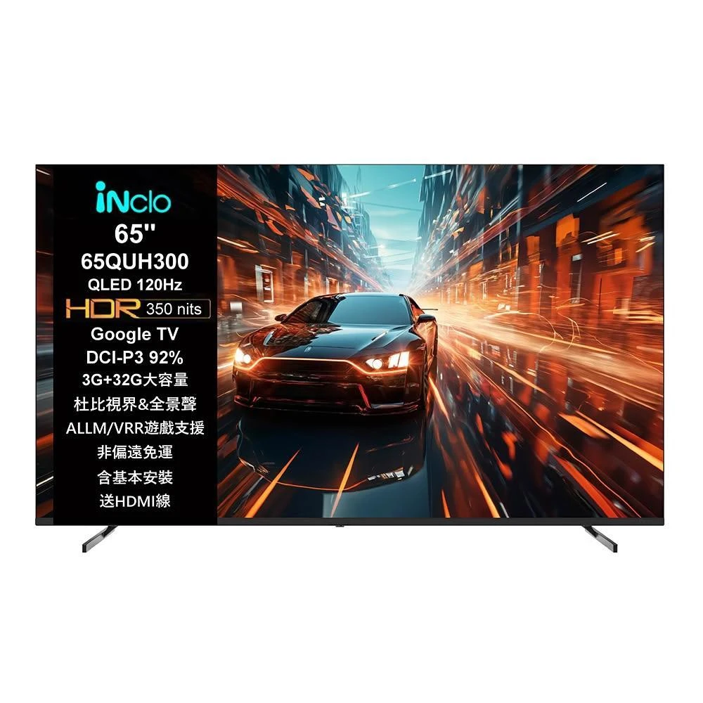iNclo65吋 4K QLED 原生120Hz Google TV 智慧顯示器|智慧電視,65QUH300