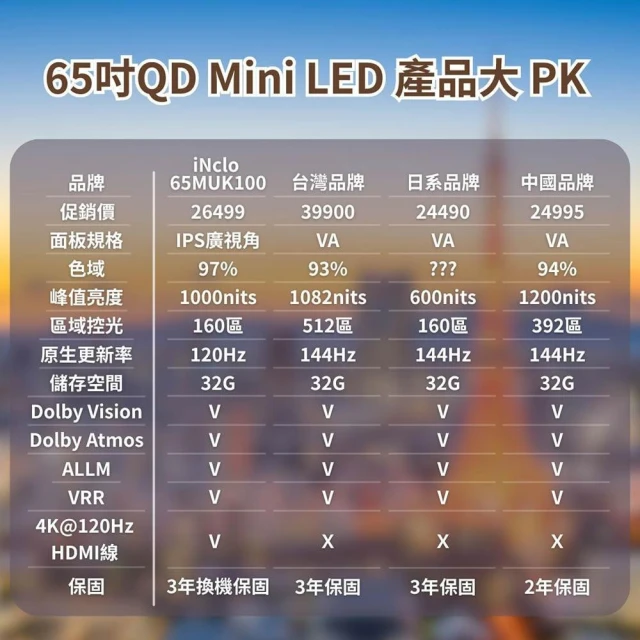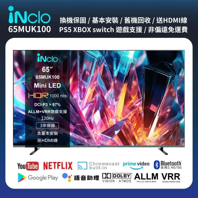 iNclo65吋 QD Mini LED Google TV 智慧顯示器|智慧電視,65MUK100