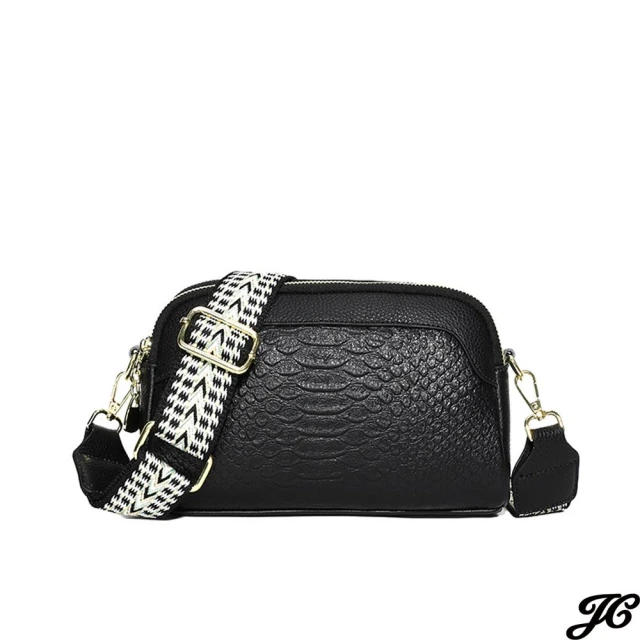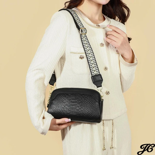 JC Collection牛皮時尚精巧皮革紋大容量寬肩帶舒適斜背包(黑)