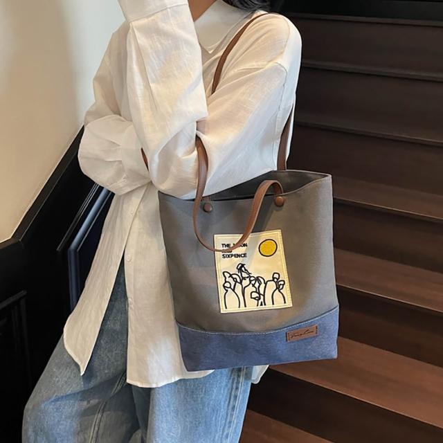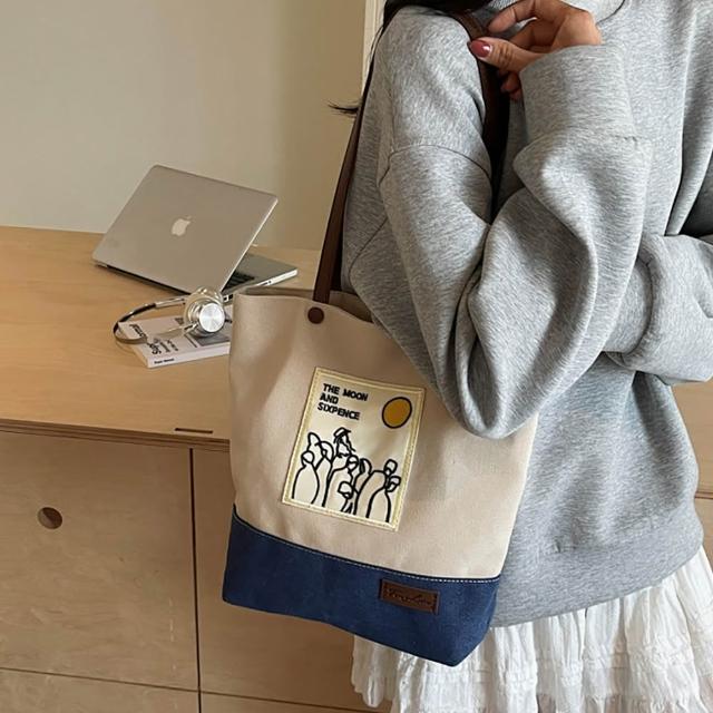 JC Collection時尚帆布拼接雙色刺繡大容量通勤學院購物側肩包黑色、米白色、卡其色)