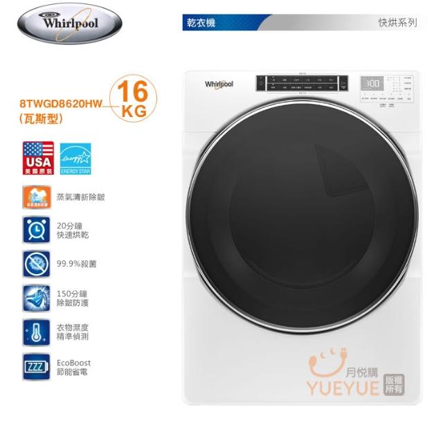 Whirlpool 惠而浦( 8TWGD8620HW ) 16KG 美製 37行程快烘滾筒式乾衣機-瓦斯型《送基本安裝,舊機回收另計》