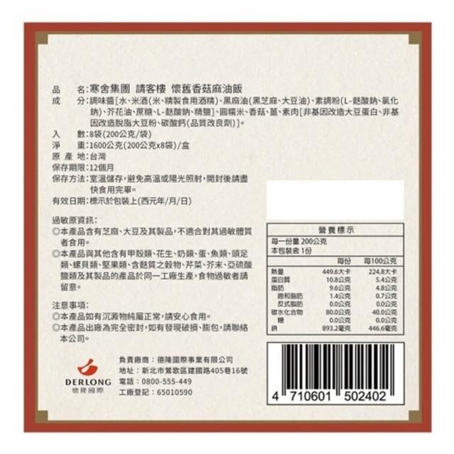 寒舍集團寒舍集團 請客樓 香菇麻油飯 200公克X8包