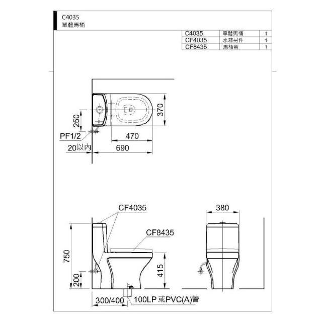 HCG 和成單體馬桶 C4034MUS 噴射虹吸式 一體成形馬桶 管距40公分