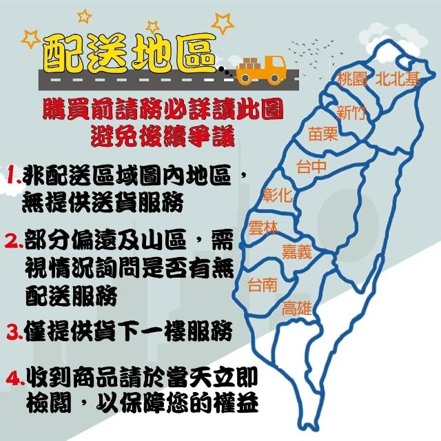 - 針對大型商品(包括:大型家電、家具床墊、健身按摩器材、車類...等),商店將於完成收款確認後,一天內〈不含例假日〉將會有專人與您確認相關配送細節等的聯繫。偏遠地區、樓層費及其它加價費用,皆由商店於約定配送時一併告知,商店將保留出貨與否的權利。