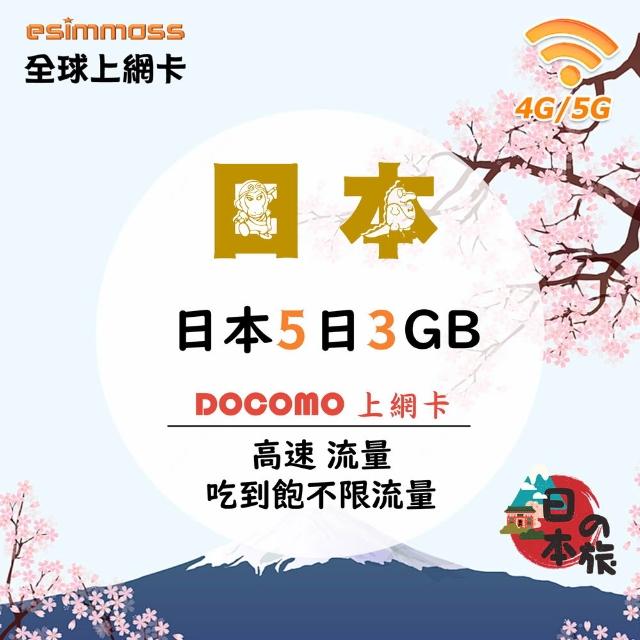 esimmoss日本上網卡 5天 3GB 上網 吃到飽 日本網卡 流量無限 DOCOMO 4G高速上 softbank