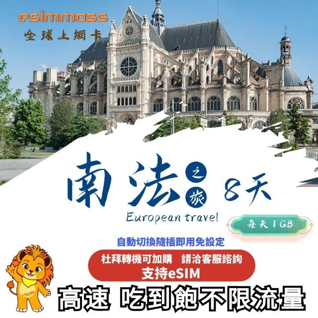 esimmoss歐洲 南法 法國 上網卡 8天 8GB 高速 電信商自動切換 支持eSIM 免設定吃到飽 5G/4G 網速 上網 SIM卡 (歐洲上網卡 吃到飽 流量無限 德國 瑞士 土耳其 杜拜 轉機 5G 4G高速上網 歐洲 歐洲上網 歐洲網卡 EU