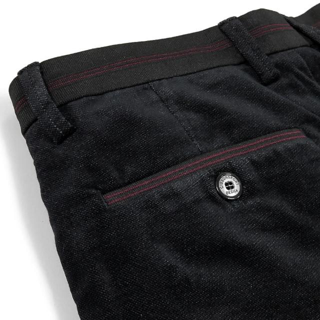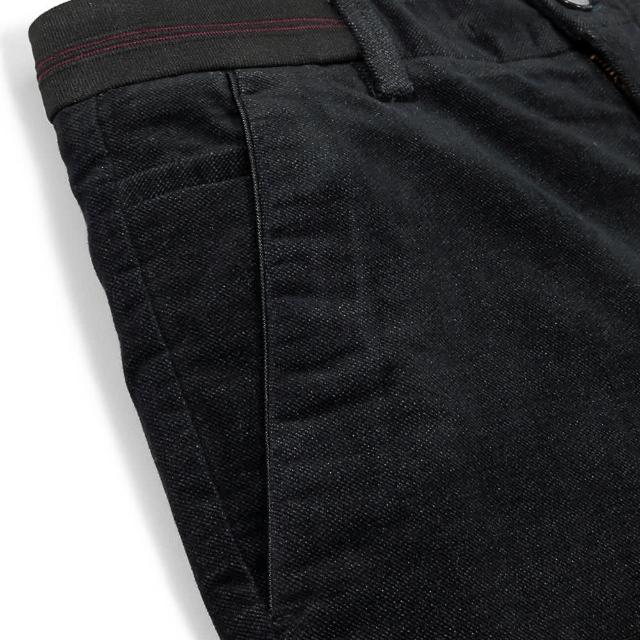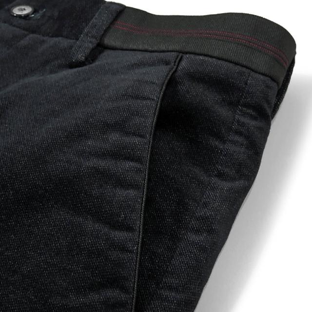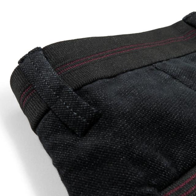 - 紅線織紋裝飾腰帶與背口袋設計