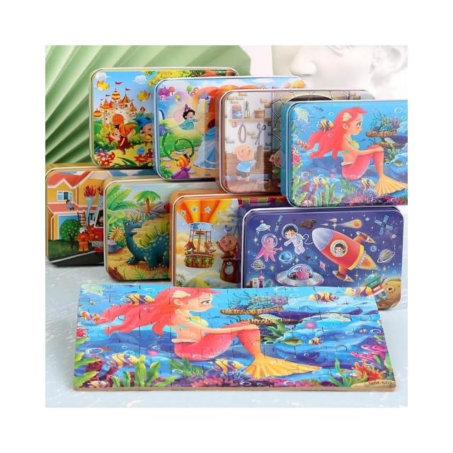 隔日到貨🌈60片兒童益智拼圖 木製鐵盒拼圖 卡通拼圖益智玩具 幼稚園生日分享禮物 美人魚 動物恐龍 交通工具 童話故事