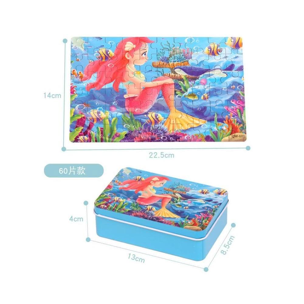 隔日到貨🌈60片兒童益智拼圖 木製鐵盒拼圖 卡通拼圖益智玩具 幼稚園生日分享禮物 美人魚 動物恐龍 交通工具 童話故事
