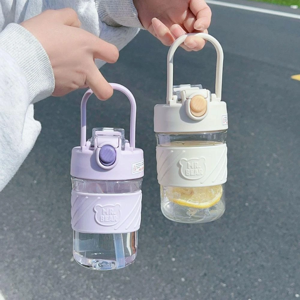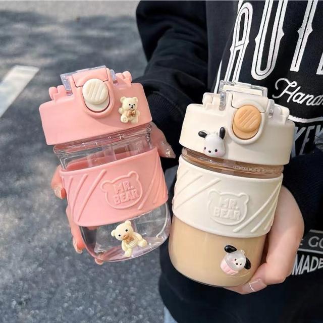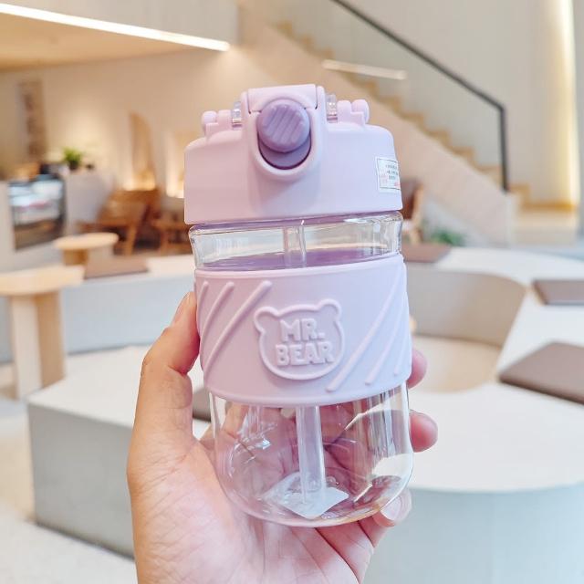 杯子 奶油小熊吸管隨身杯 隨行杯 小熊 吸管 手提功能 食品級材質 水壺 水瓶 水杯 玻璃杯