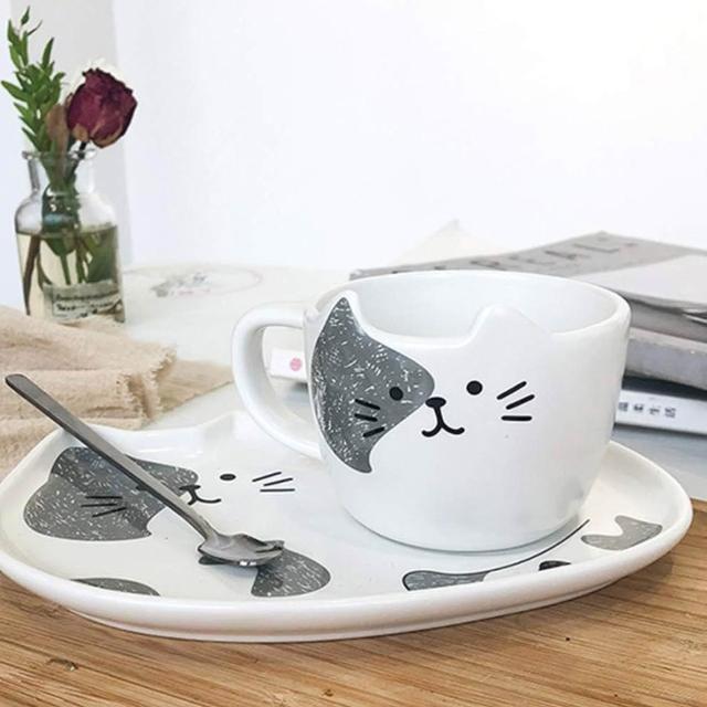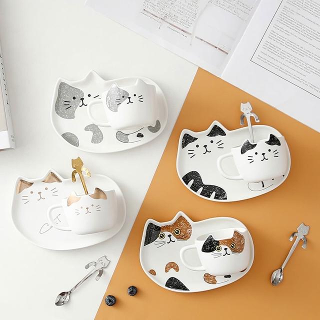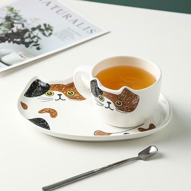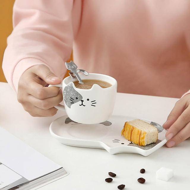 版畫風貓咪下午茶杯具組 杯具組 貓咪馬克杯 馬克杯 咖啡杯 餐盤 下午茶具 餐具組 貓咪咖啡杯 陶瓷杯子