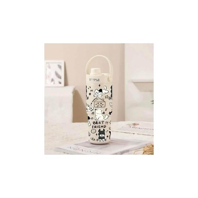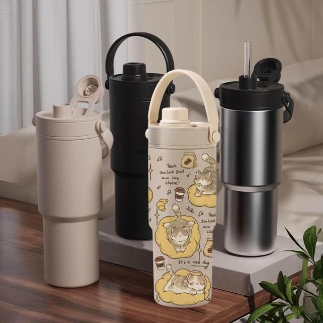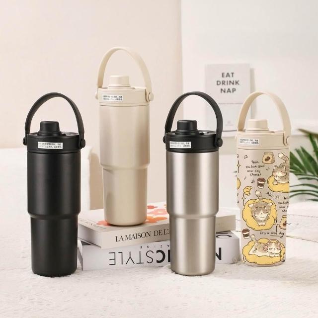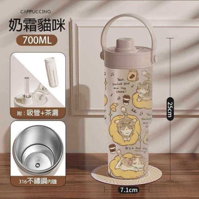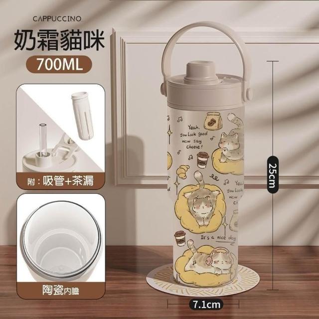 陶瓷內膽 保溫杯 700ml 不鏽鋼 伸縮吸管 矽膠提把 冰霸杯 附茶漏 高硼矽 玻璃吸管 可拆洗 直飲 貓咪杯 貓