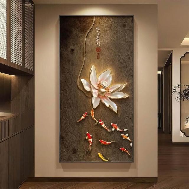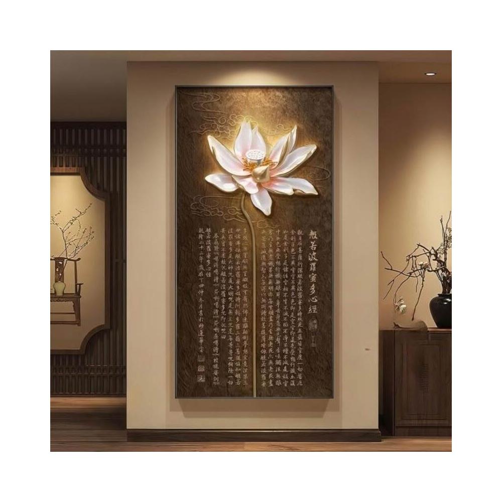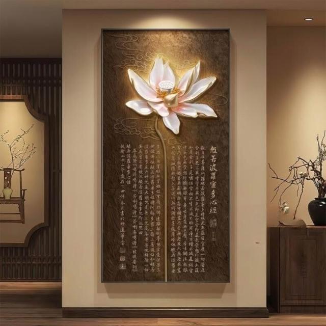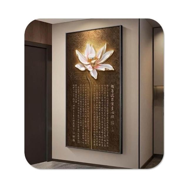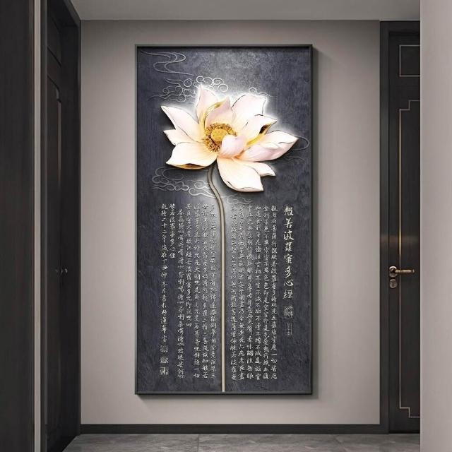 新中式荷花入戶玄關裝飾畫禪意心經茶室走廊掛畫客廳過道豎版壁畫