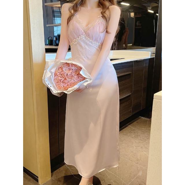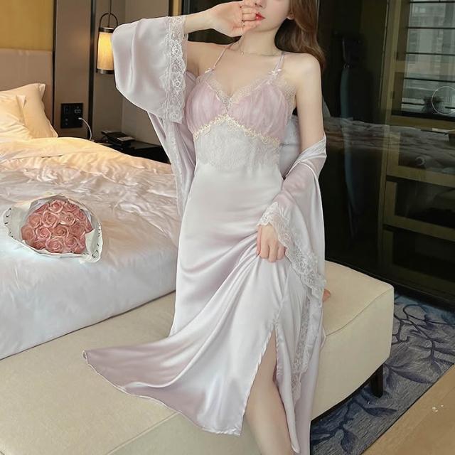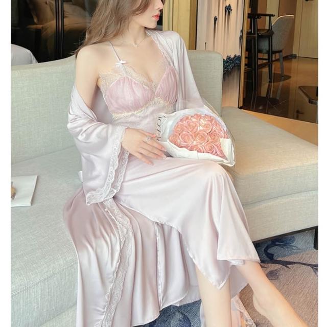 LE FLIRT 高級純慾風氣質仙氣帶胸墊蕾絲睡裙 冰絲過膝長款蕾絲睡裙 女睡衣 公主風外袍兩件套長裙家居服 仙女裙 套裝睡袍