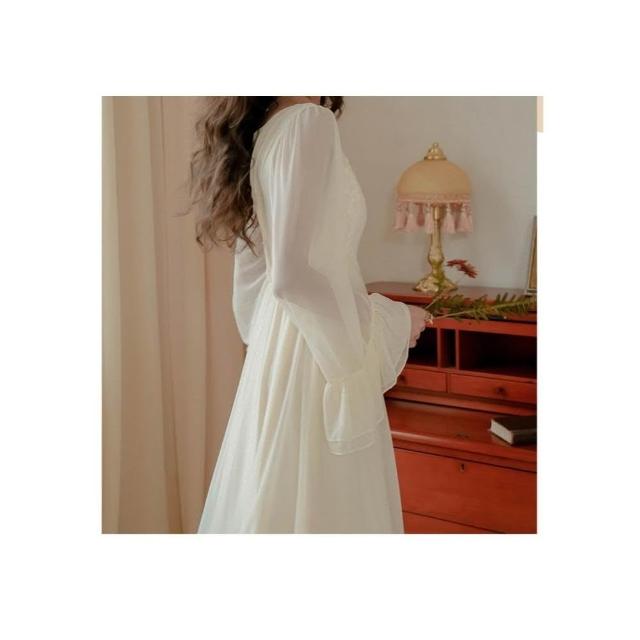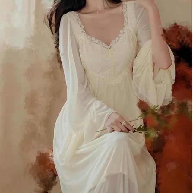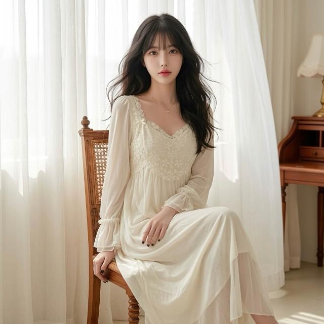 LE FLIRT 法式網紗女過膝長款睡衣 浪漫蕾絲長袖睡裙 氣質睡裙 甜美睡衣 高貴睡衣 居家服 洋裝睡裙 女公主風睡衣