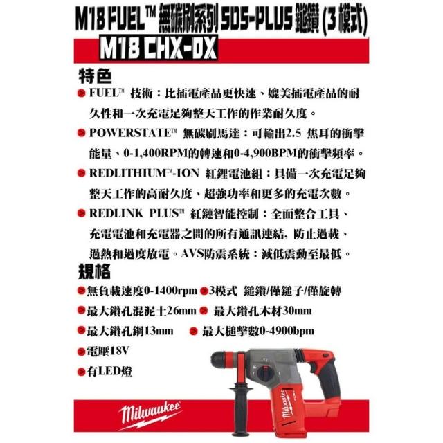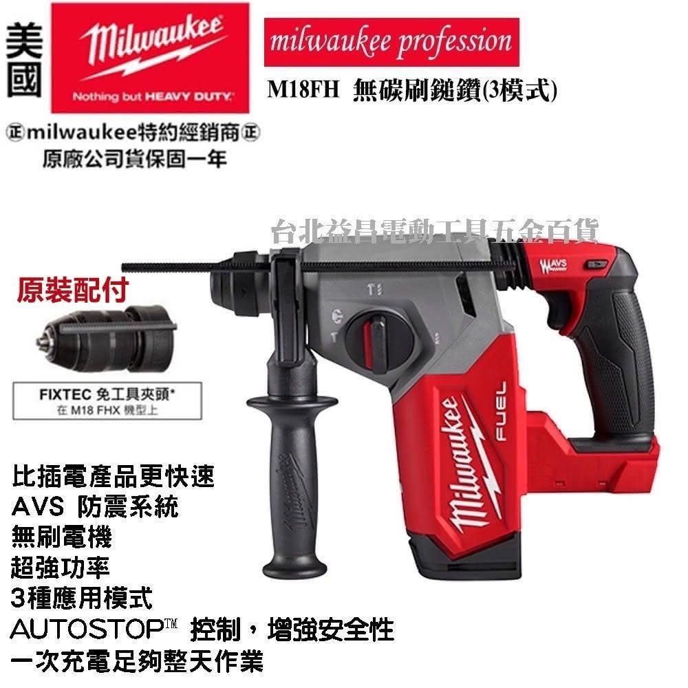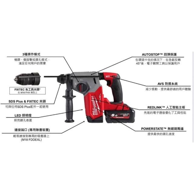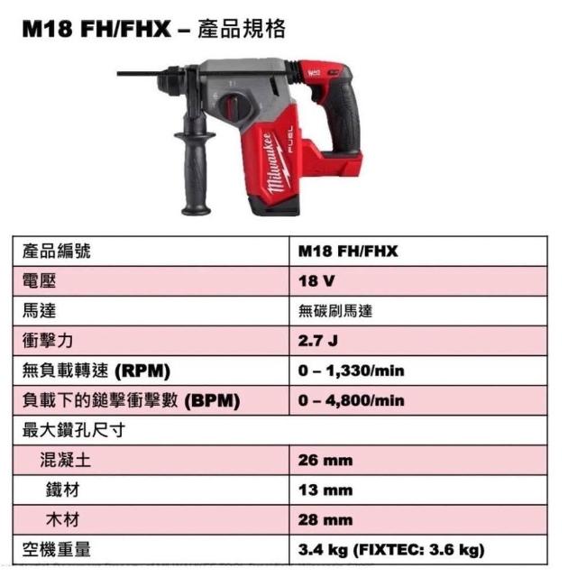 Milwaukee 美沃奇台北益昌 M18 18V 鋰電 無碳刷 免出力 鎚鑽 M18 FHX 單5.0版