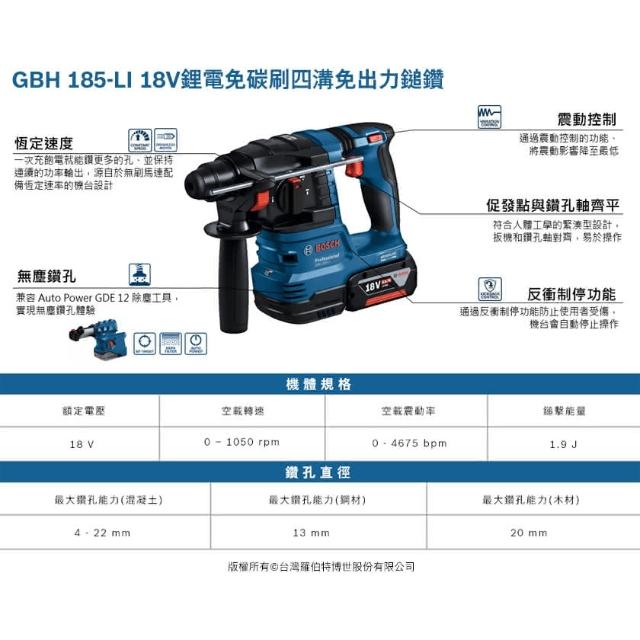 BOSCH 博世台北益昌 含稅 BOSCH 博世 GBH 185-LI 18V 四溝 免出力 鋰電 充電 鎚鑽 gbh 180 單電4.0AH版